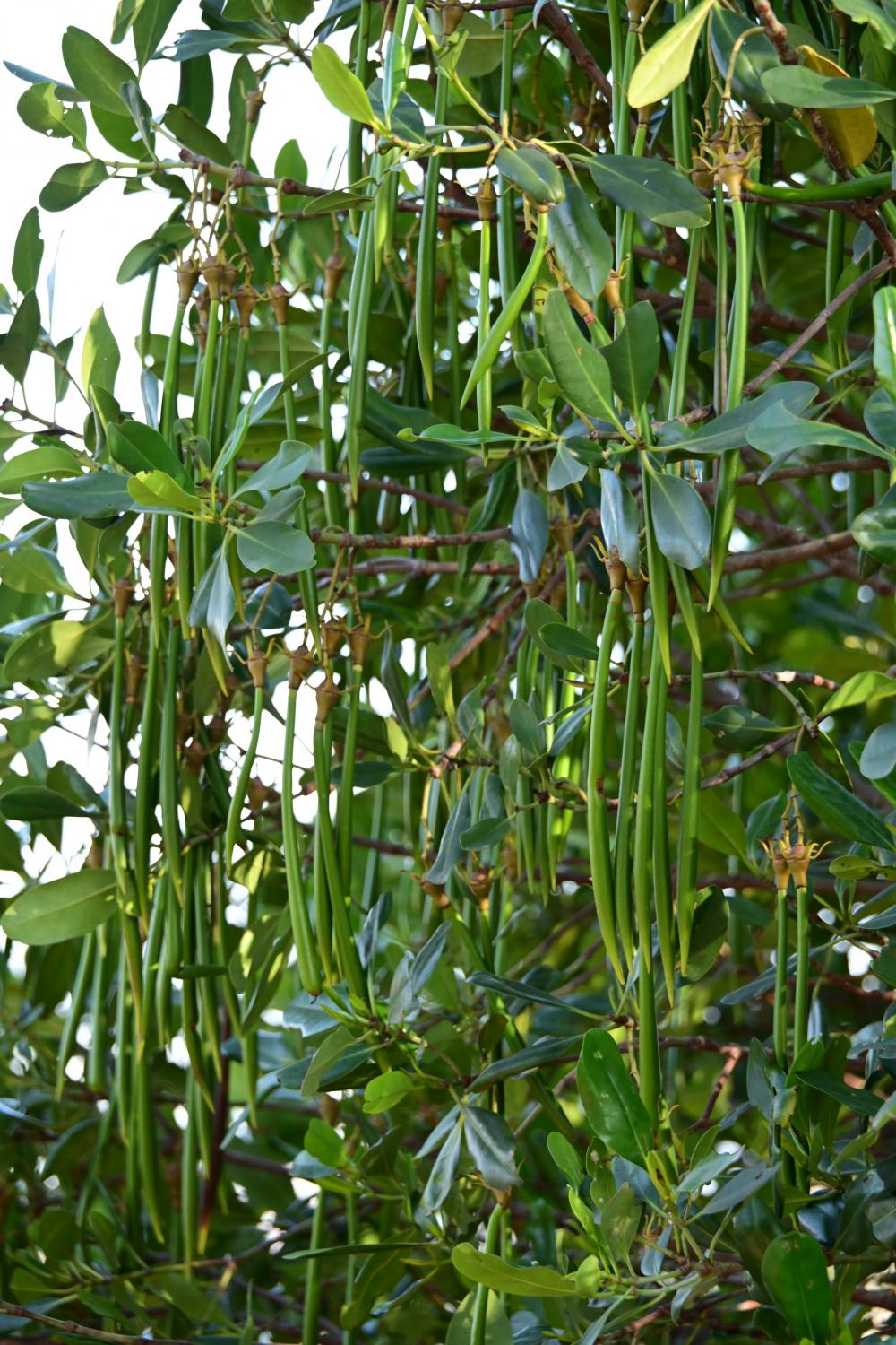 像豆角一样垂下来的东西,其实是秋茄树的胚轴,即胎生苗,种子通过这种方式在母树上直接萌发成幼苗,成熟后掉落插入滩涂扎根,这是红树植物适应潮间带环境的独特方式。