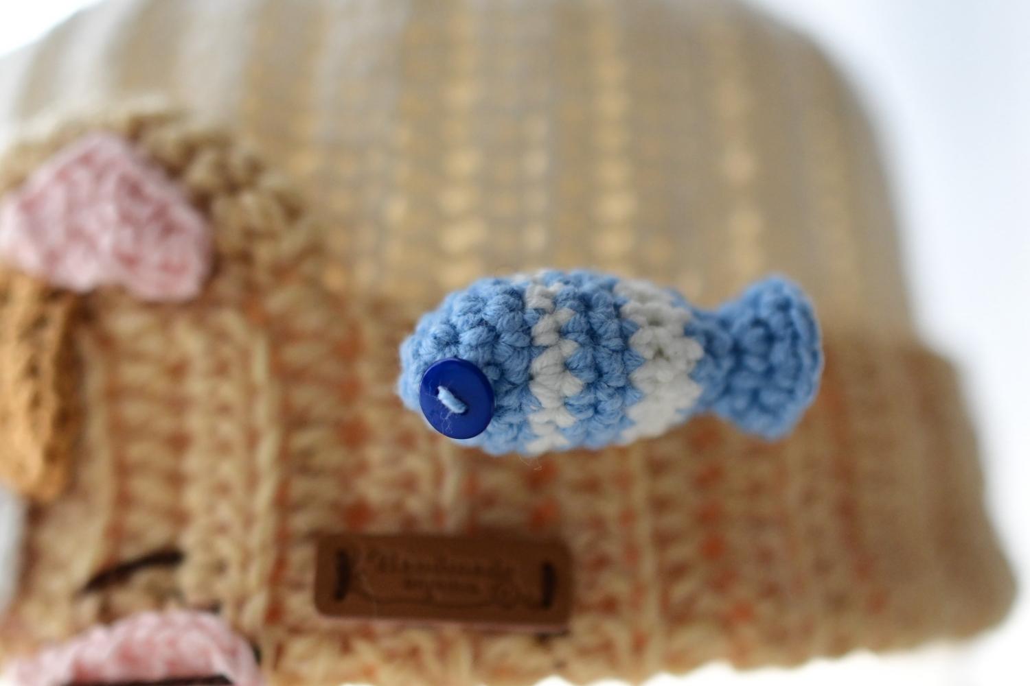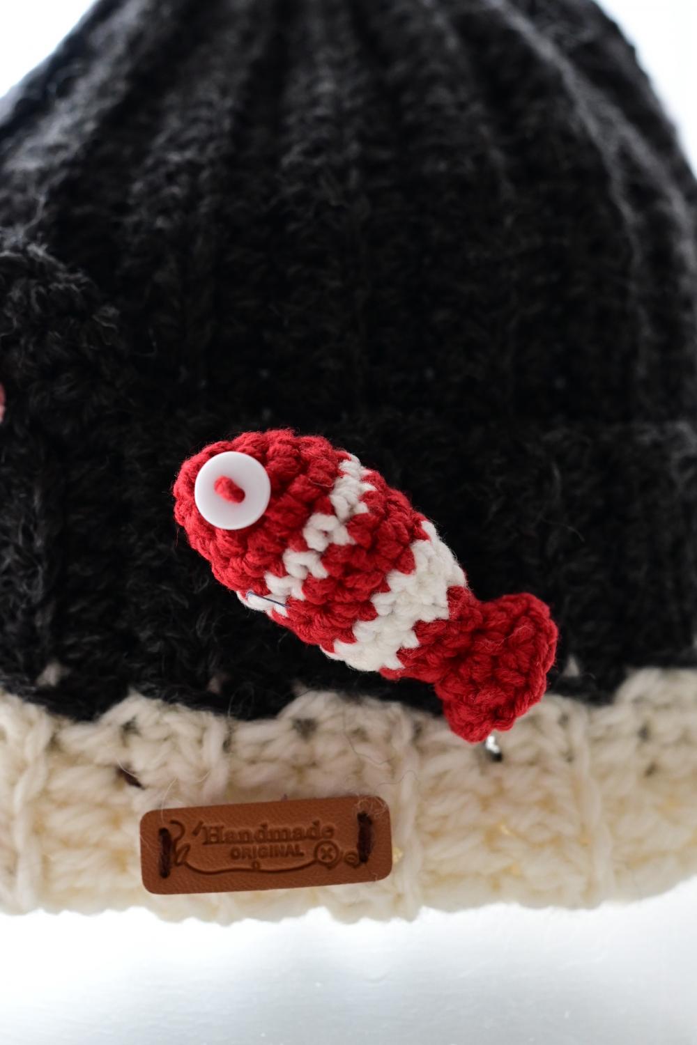 小鱼的侧面,缝了别针,别在帽身上,位置可以随意调整、切换。