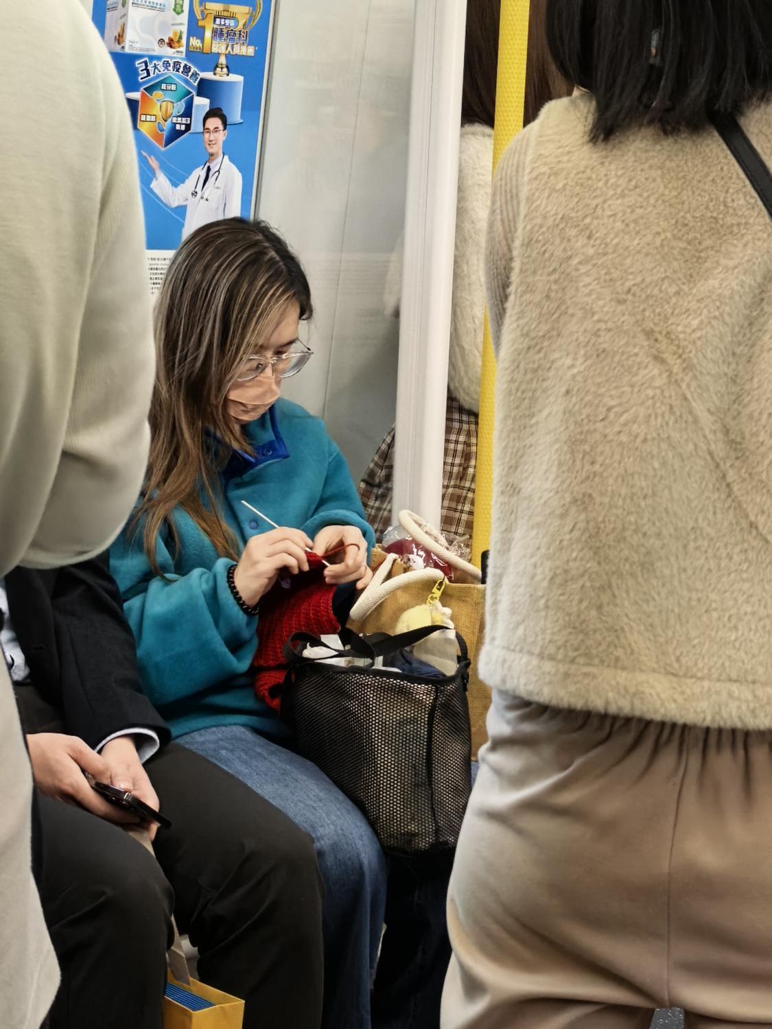 回程的地铁上,看到同样爱玩毛线的人,亲切得很。