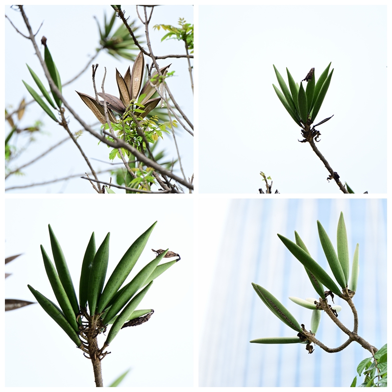 火焰木的未成熟的蒴果,是绿色的,簇生的长条形结构,初见的一刻,人是蒙的,仿佛外星来客。