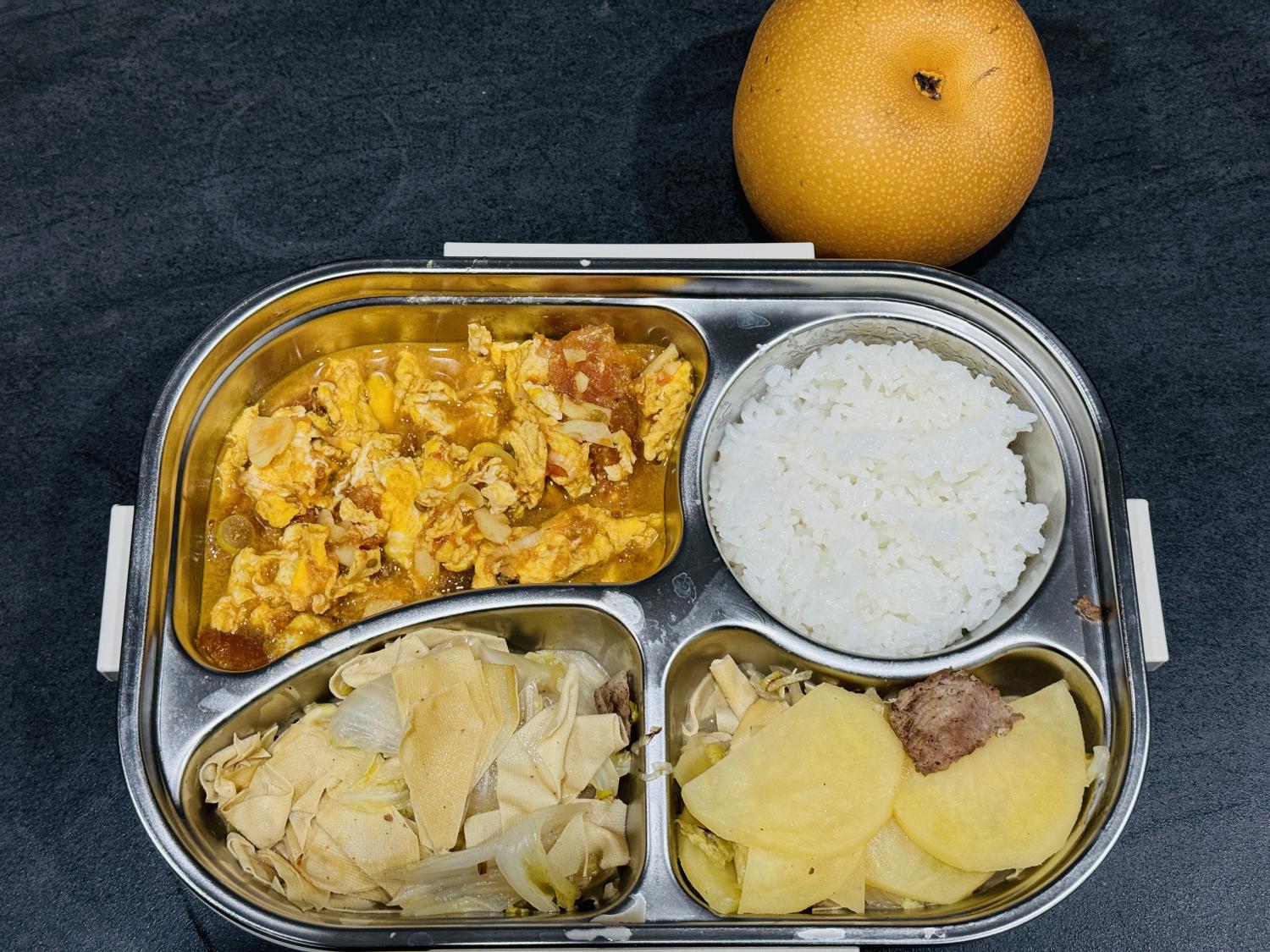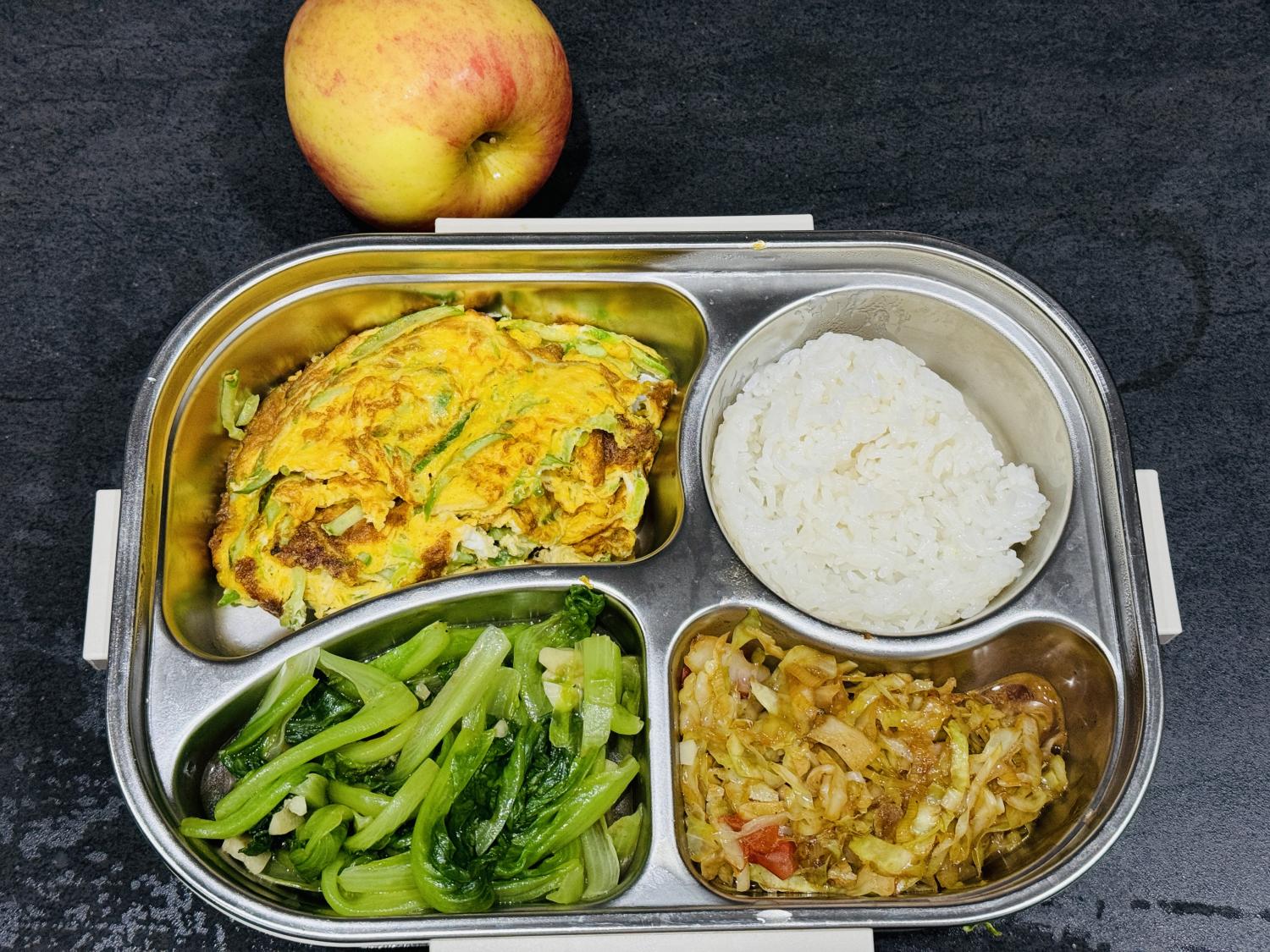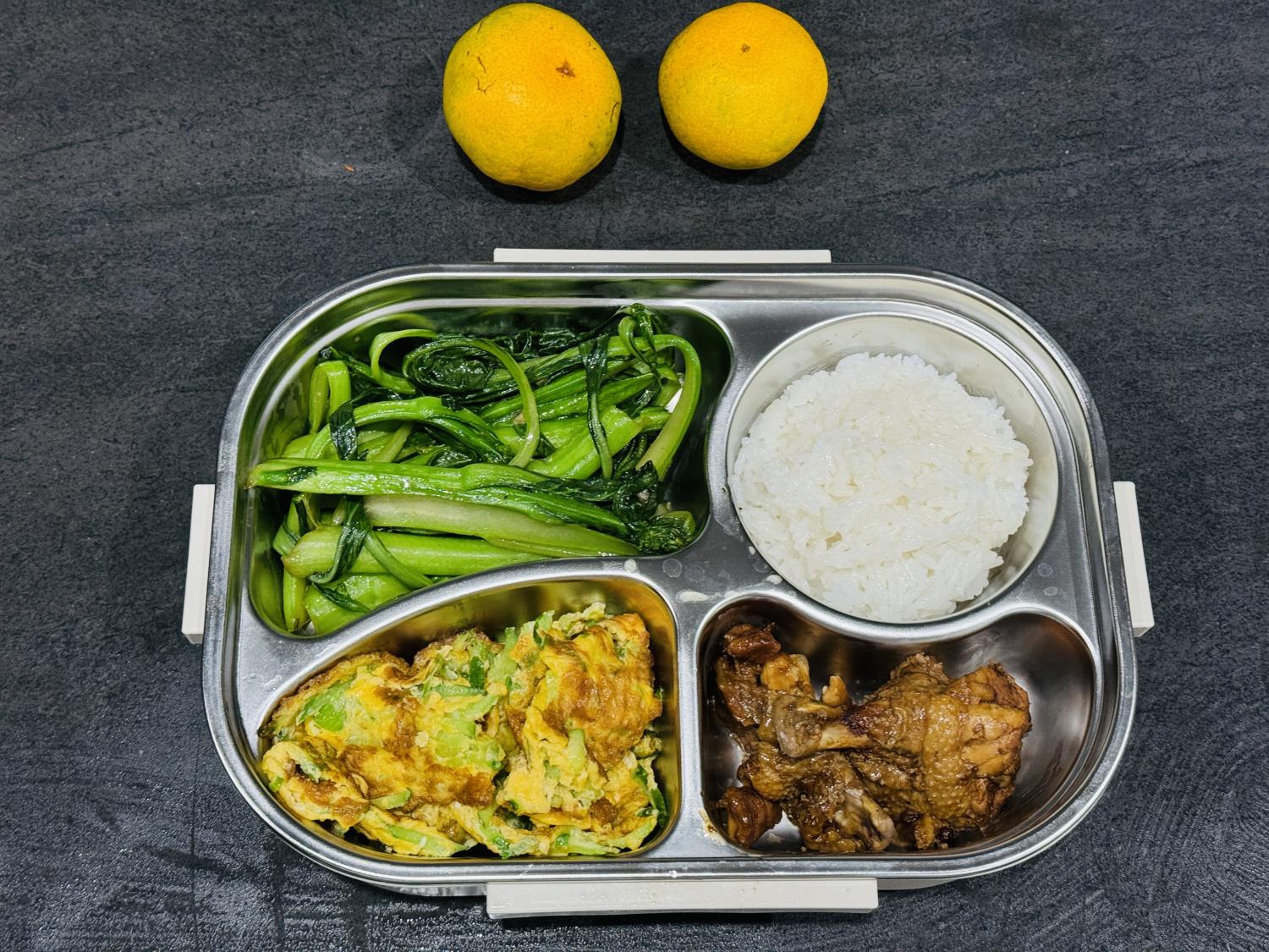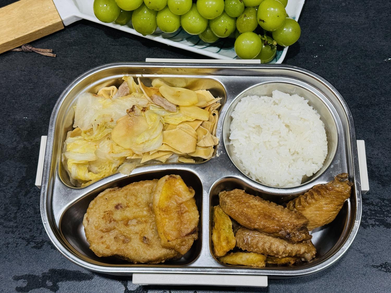饭盒里的四个格子,也不会有任何一个空着,说明每餐都至少会有三个菜。