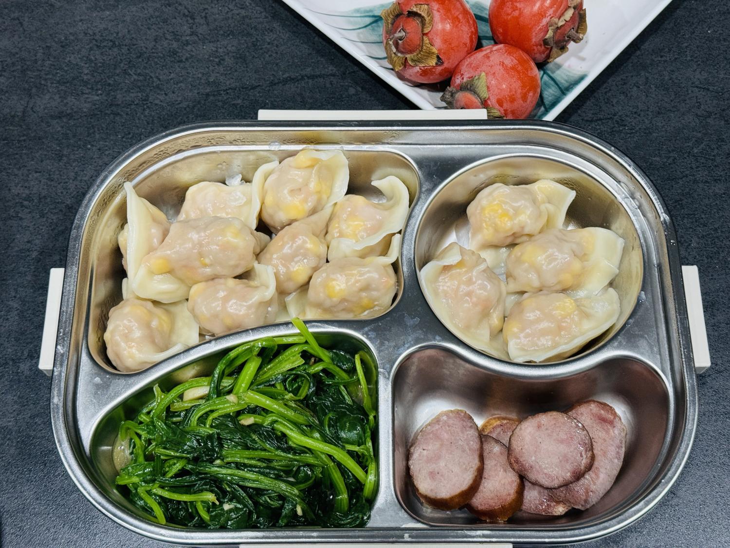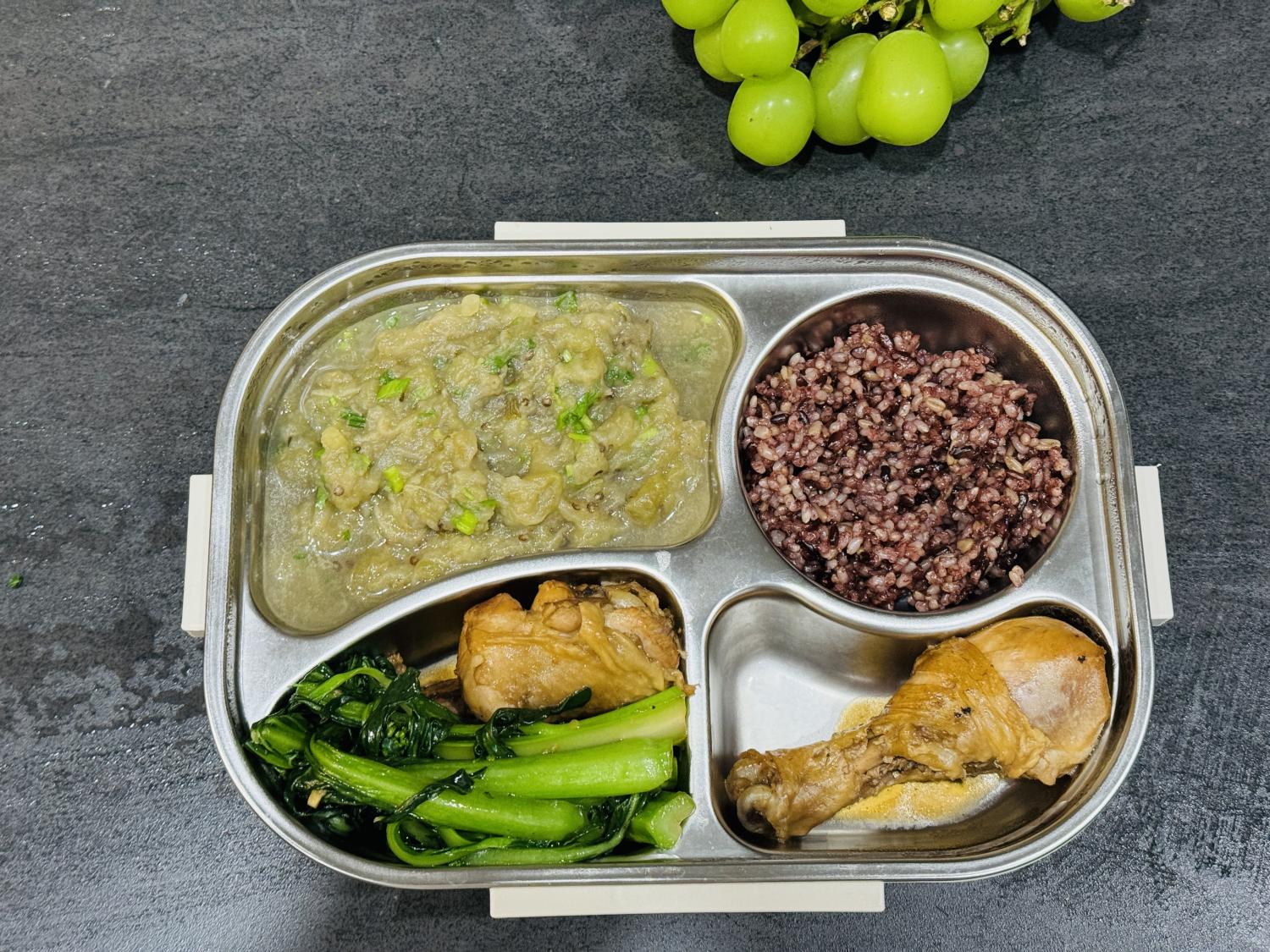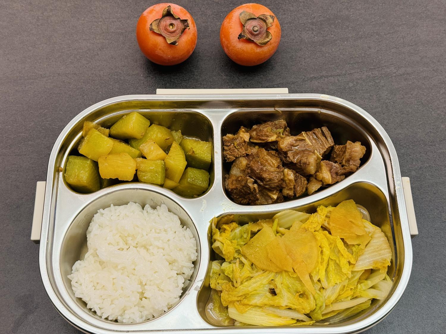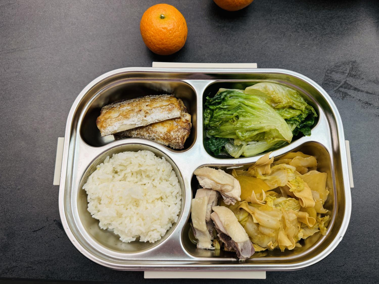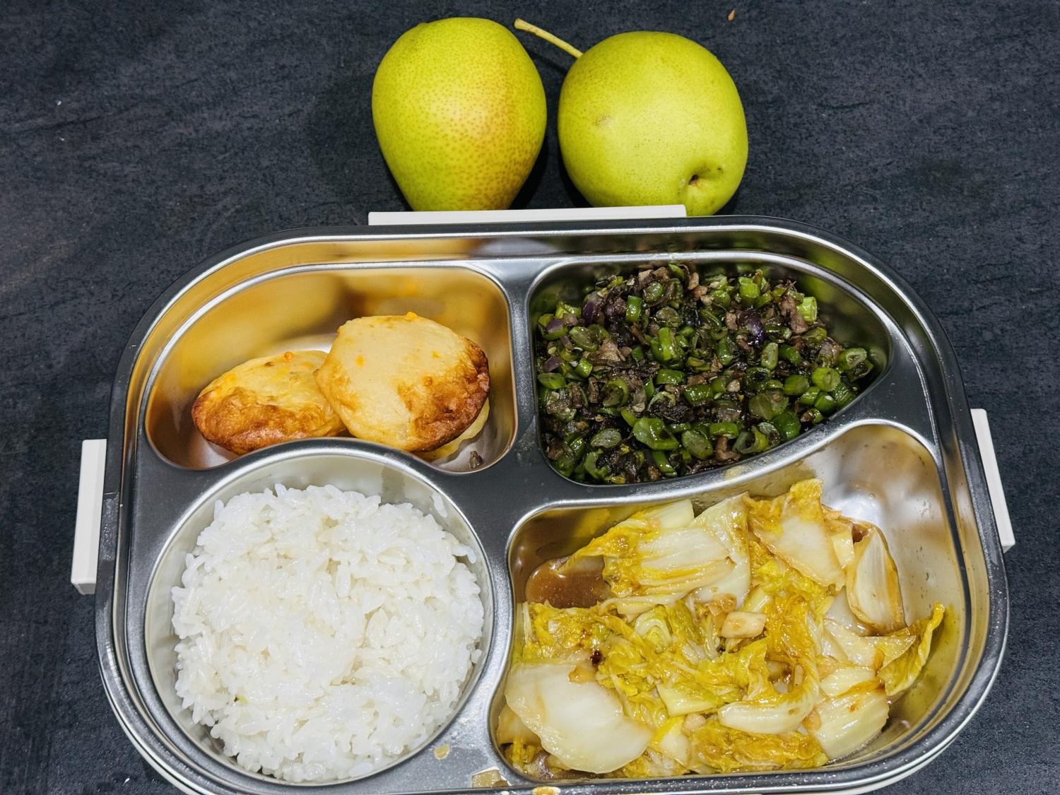 饭盒里的四个格子,也不会有任何一个空着,说明每餐都至少会有三个菜。