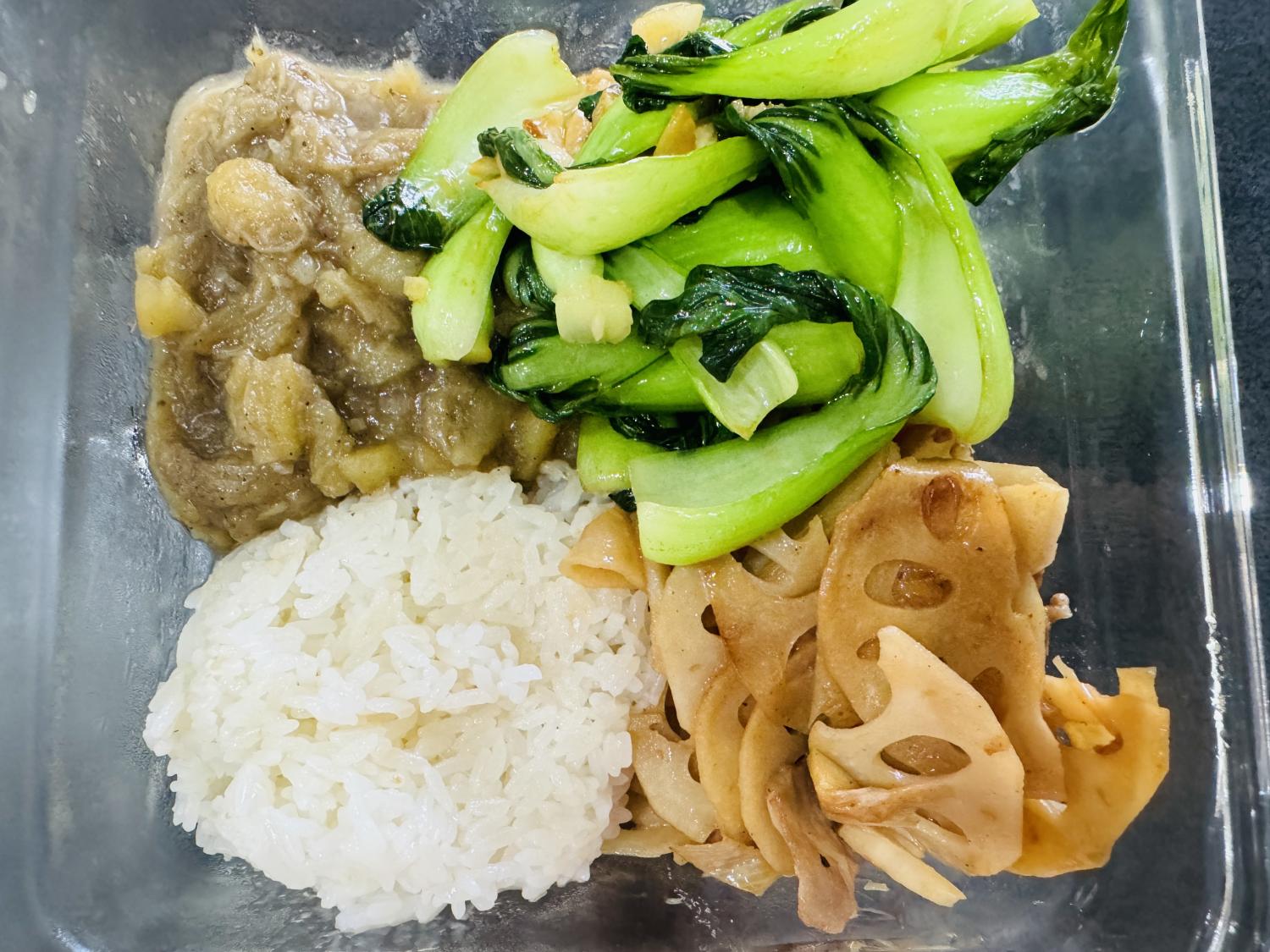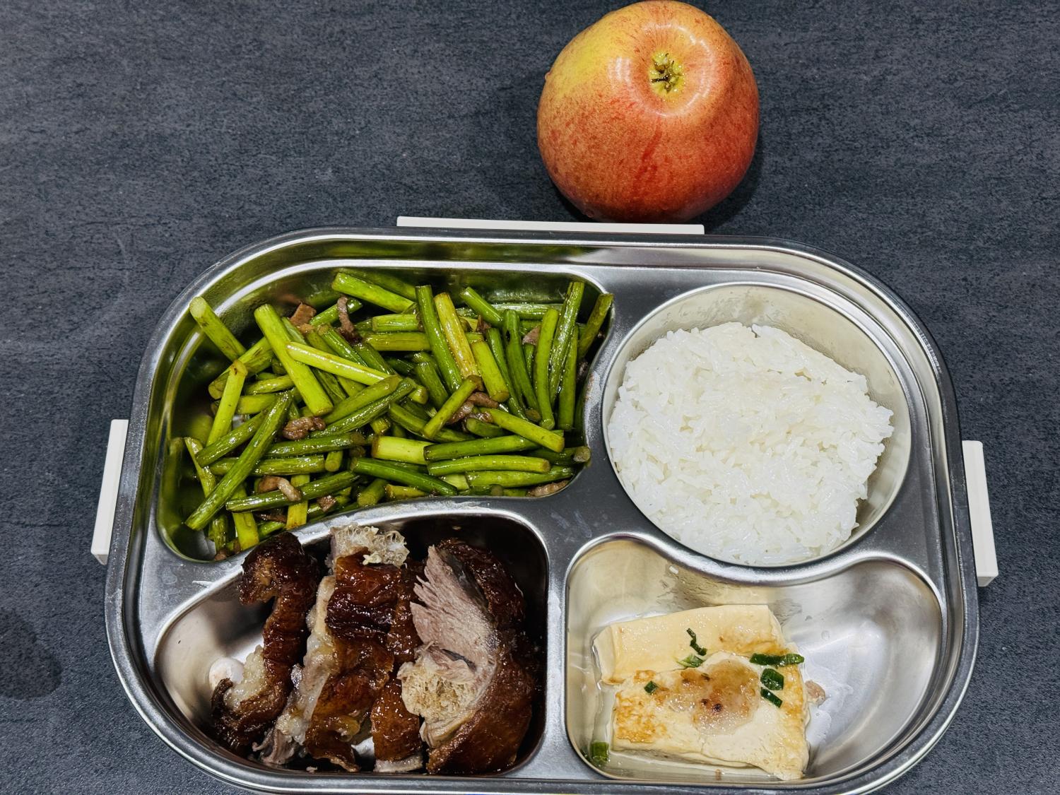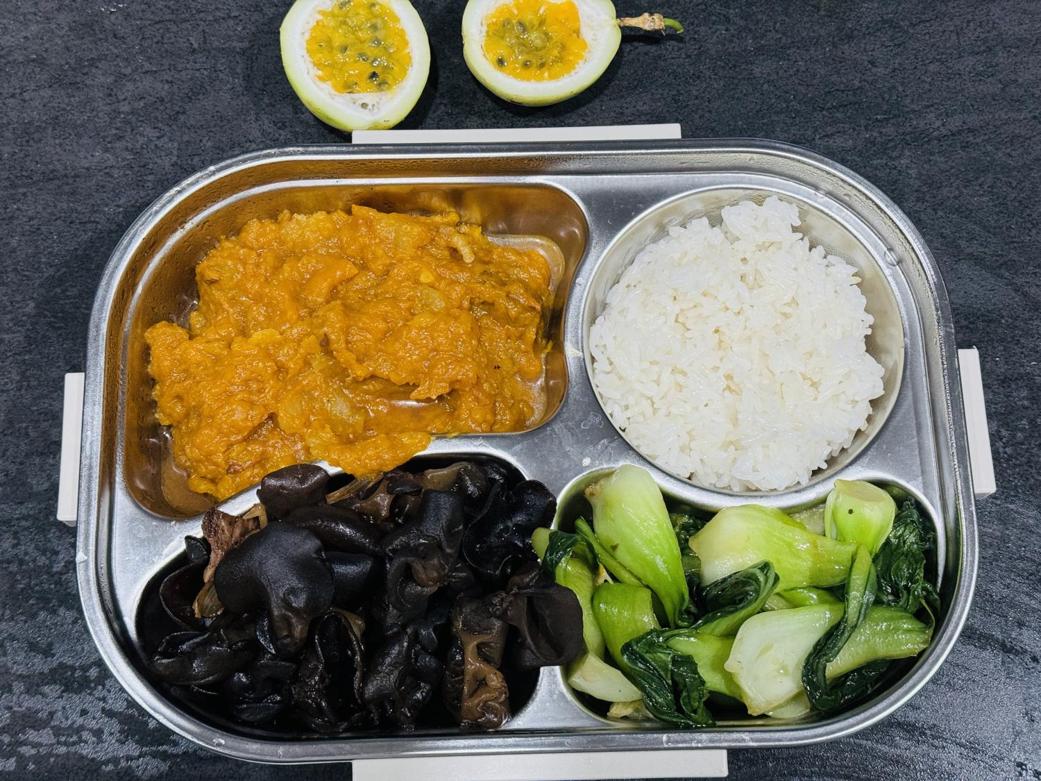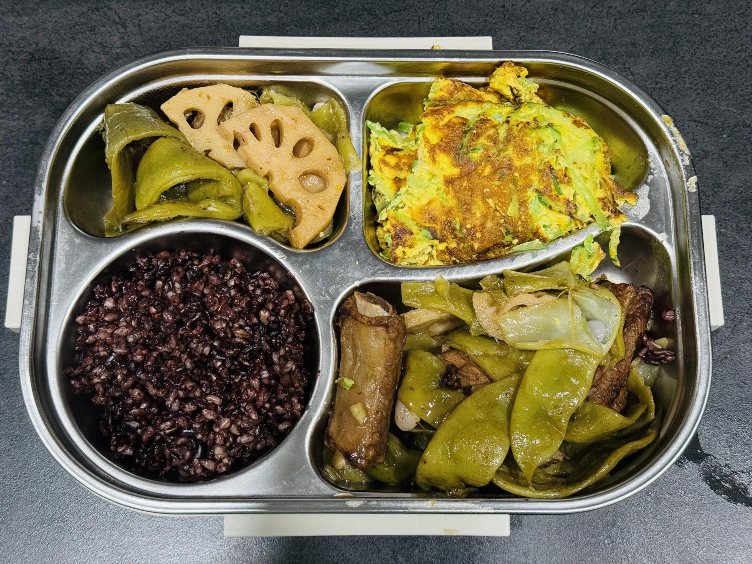 饭盒里的四个格子,也不会有任何一个空着,说明每餐都至少会有三个菜。