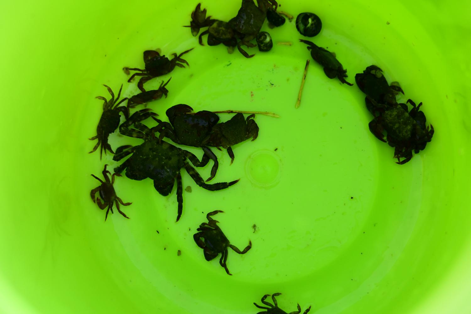 石头下的螃蟹,果然好多,一抓一堆,黑乎乎的,像蝎子。