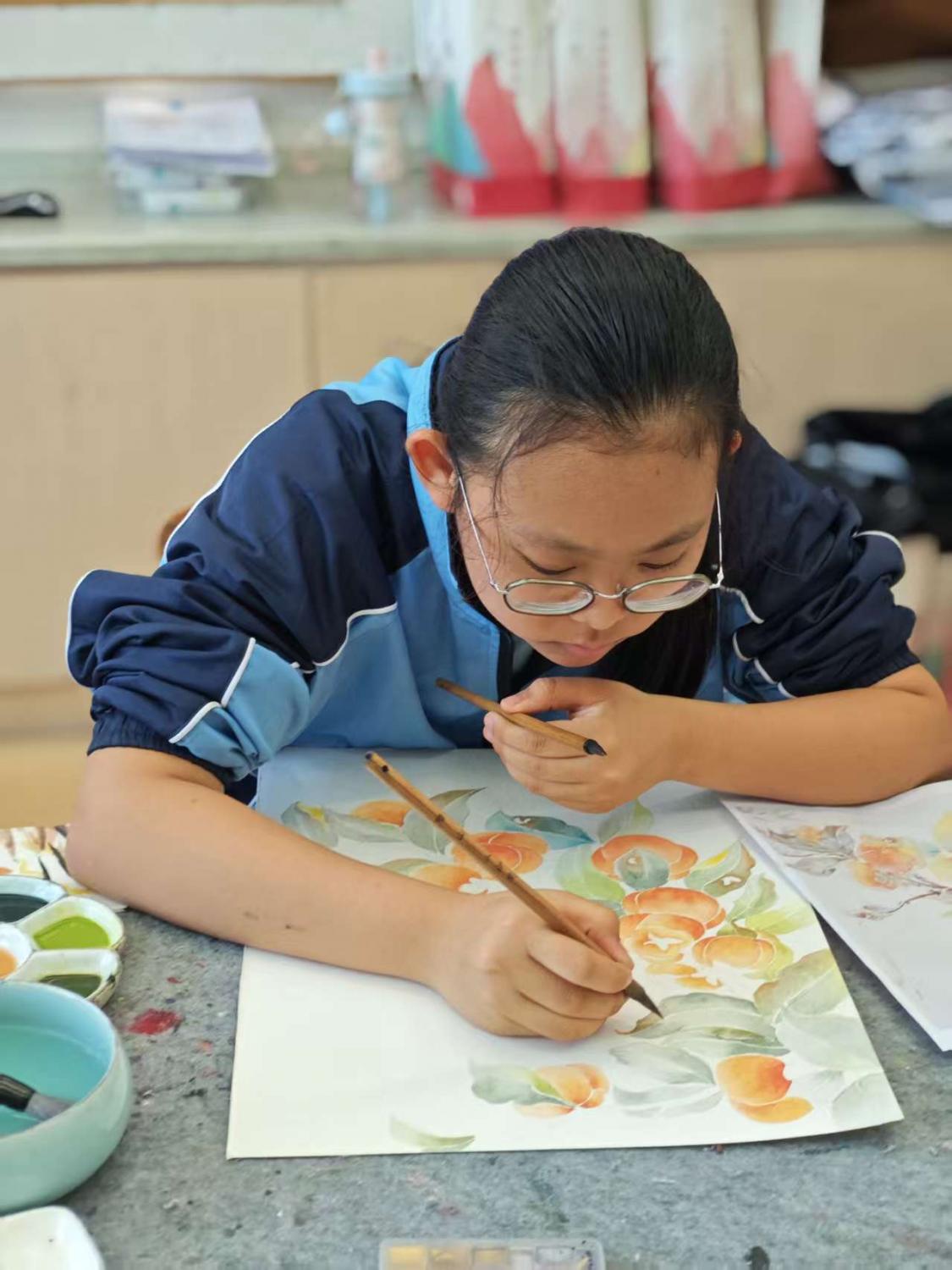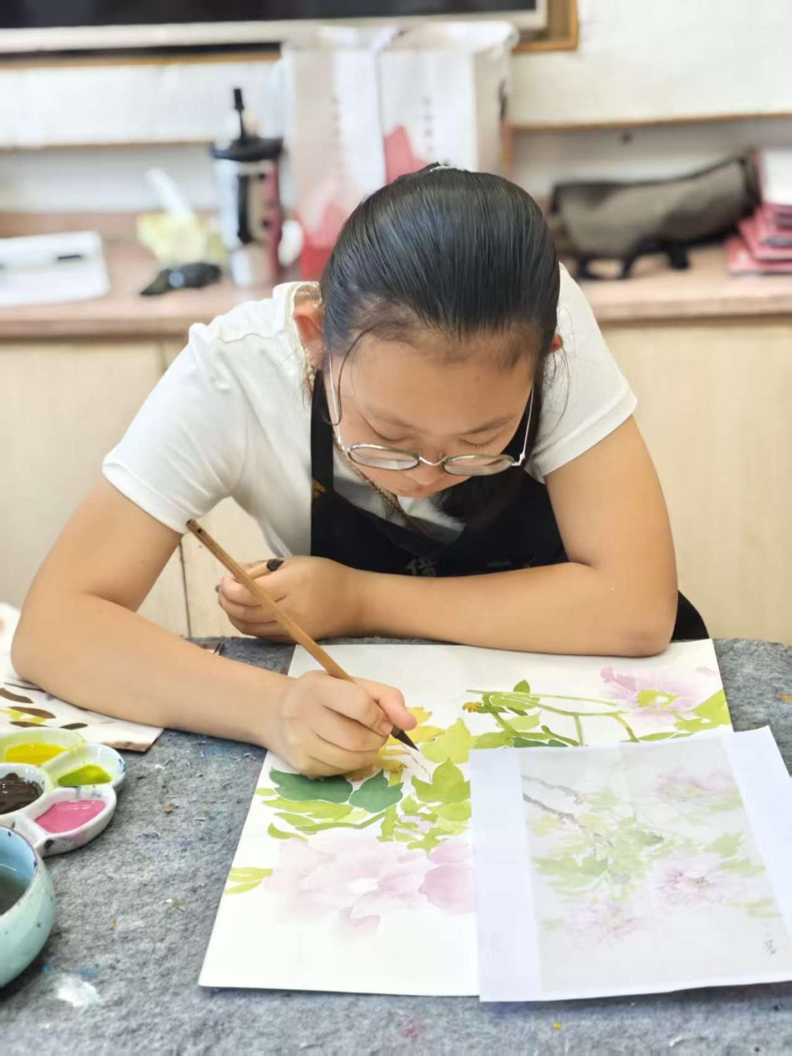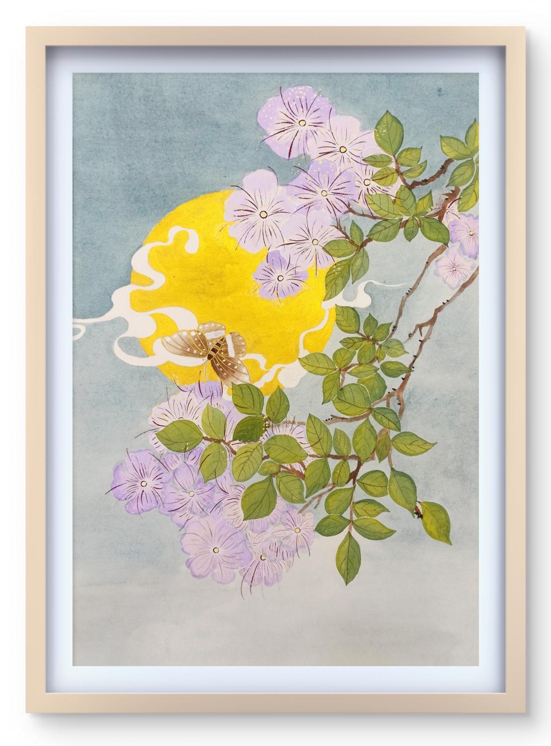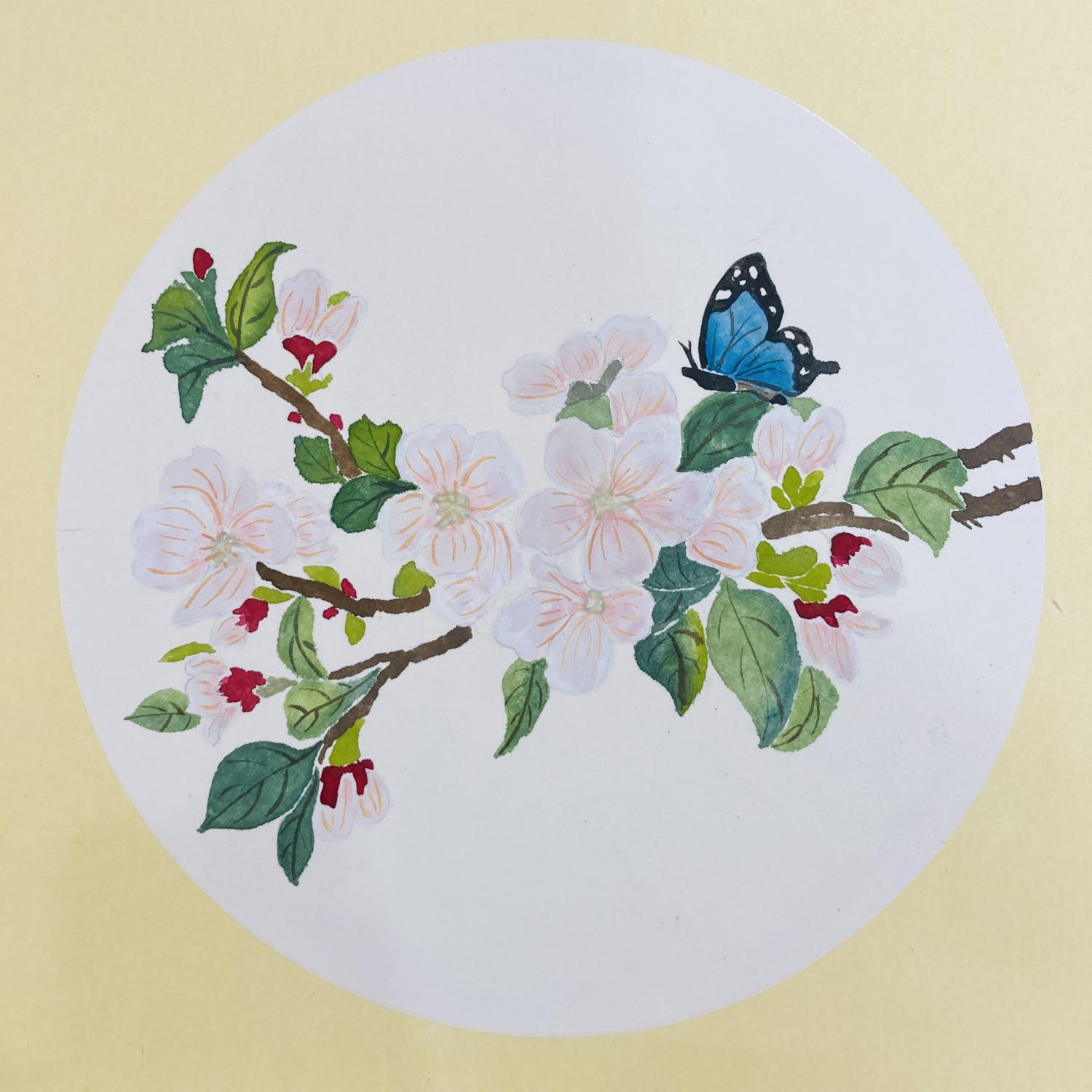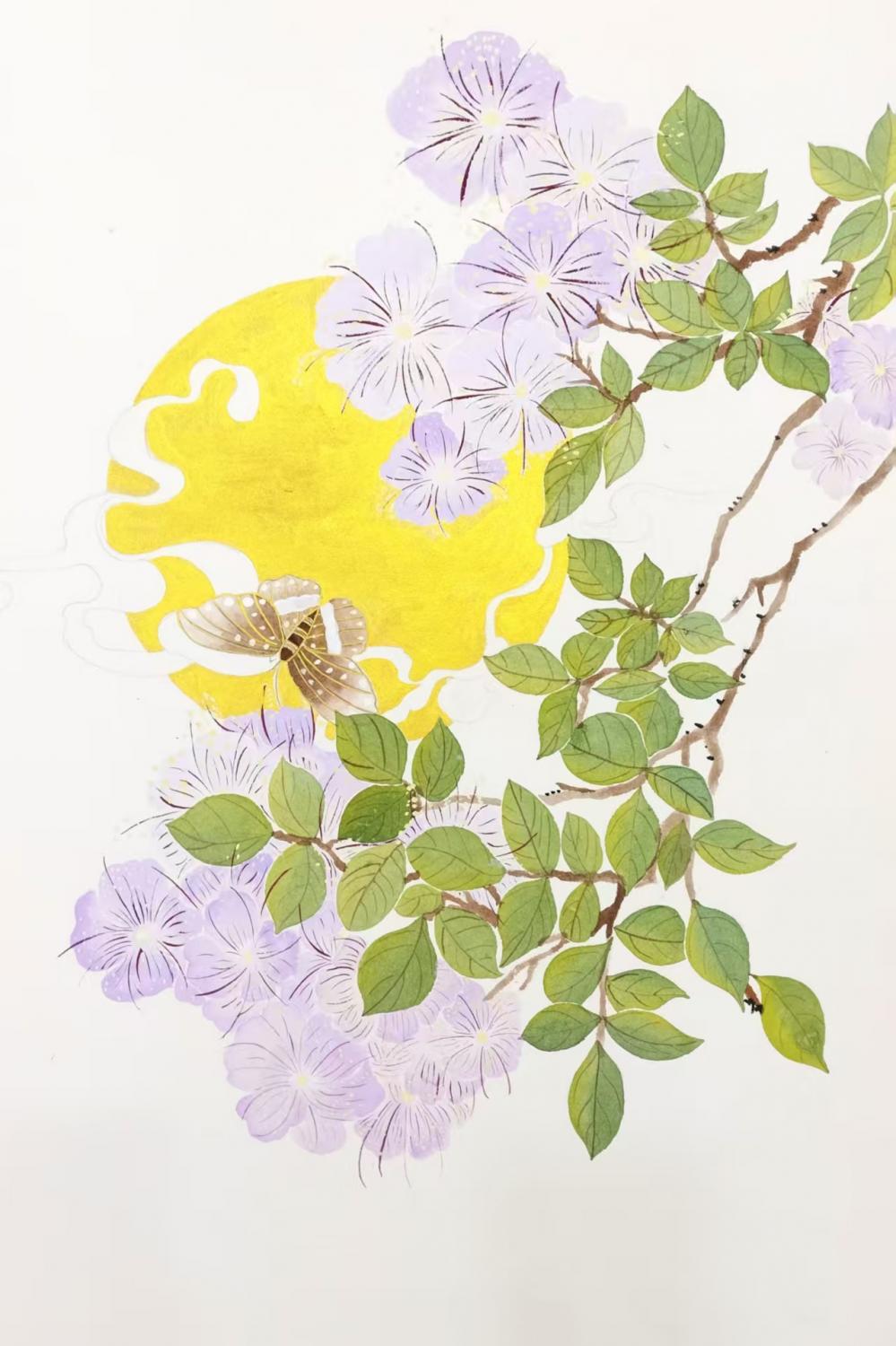 第二节课,主要完成紫薇花部分,花瓣的晕染层次丰富,紫色从浅到深的过渡自然柔和线条勾勒工整且富有生命力;蝴蝶的纹理刻画精致,与花卉、枝叶的质感形成了巧妙呼应,用金墨画出月亮的形状。