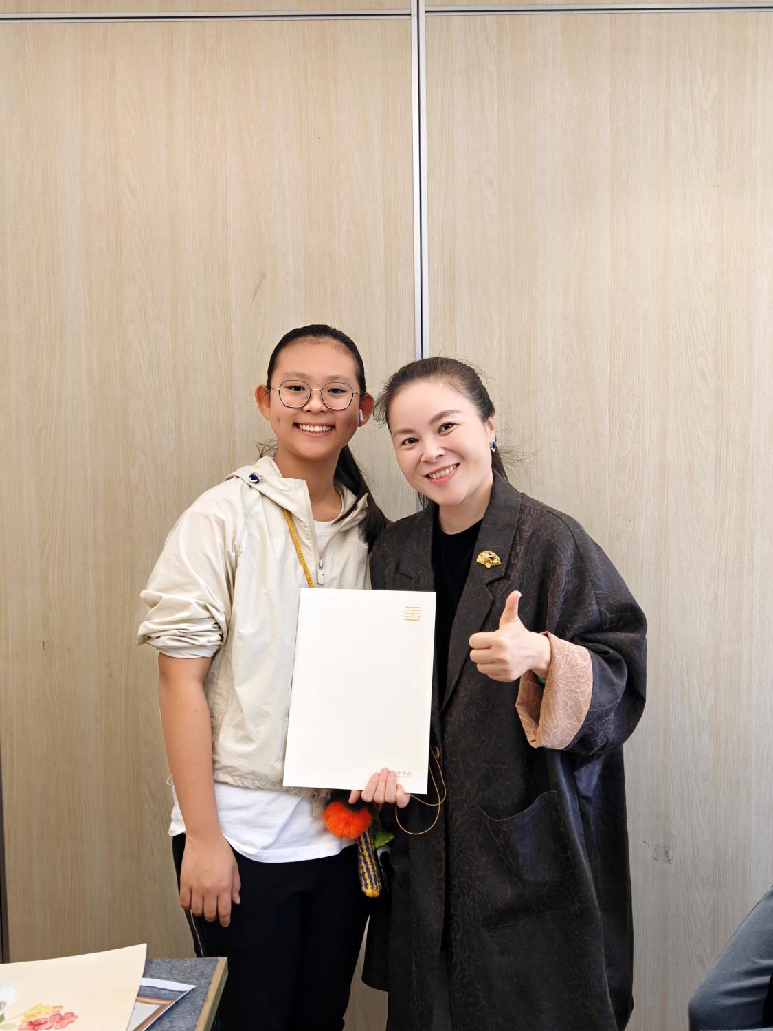 暑假考了花鸟八级,证书下来了,画馆老板齐附,也是齐白石的孙女,特意来祝贺,并与获得证书的衣襟完成合影。