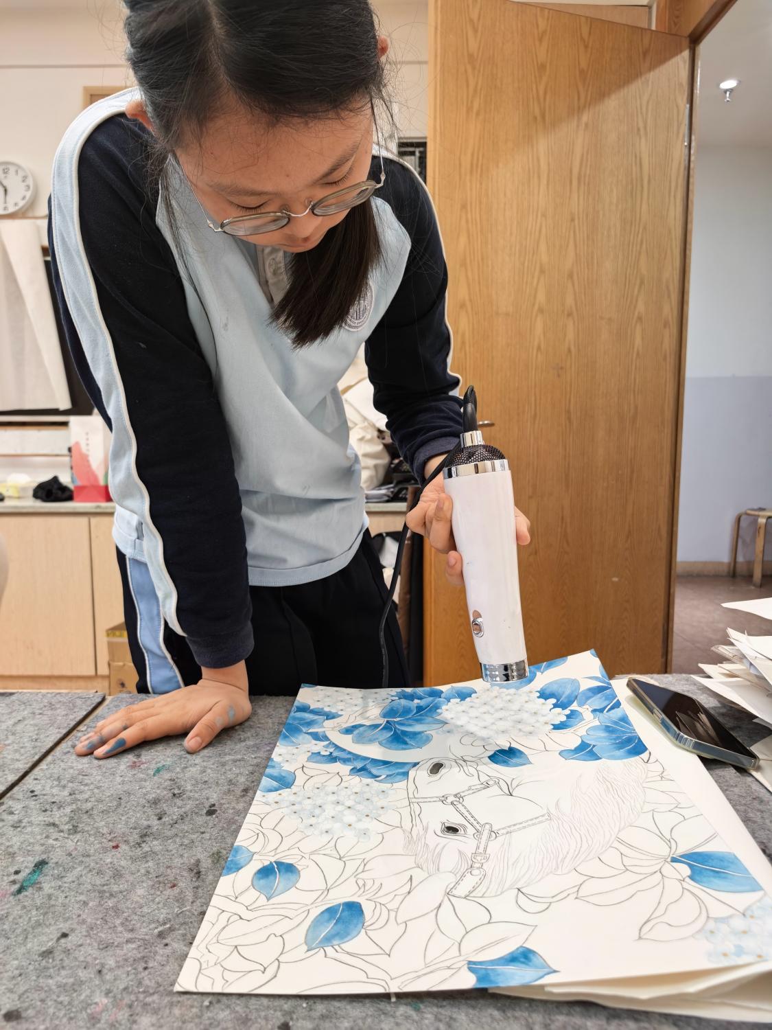 画画时,不时需要用到吹风机,把颜料吹干,才能叠加新的。