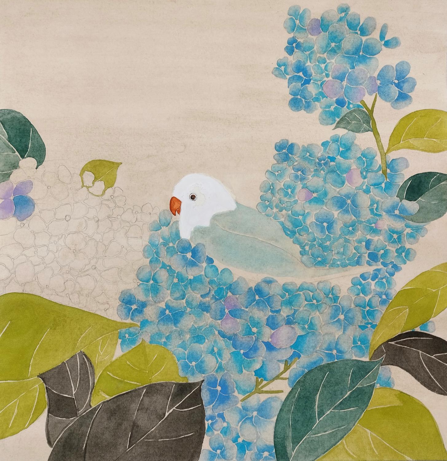 第二幅作品,是一只小鹦鹉,一旁簇拥着绣球花,非常可爱。