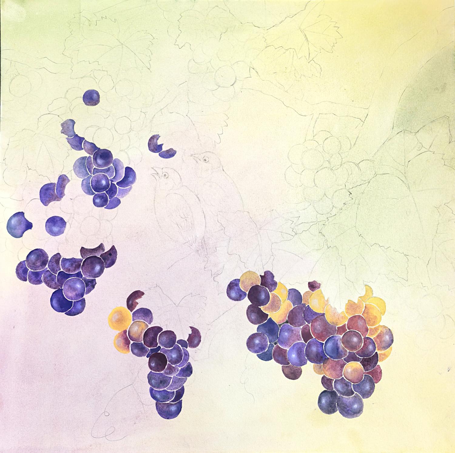 然后是给葡萄部分颜色上色,葡萄的紫色有的是用花青和曙红调的,有的是用紫色加钛白,还完成了上半部分没有完全熟透的葡萄,颜色变化非常的丰富,很真实哦。