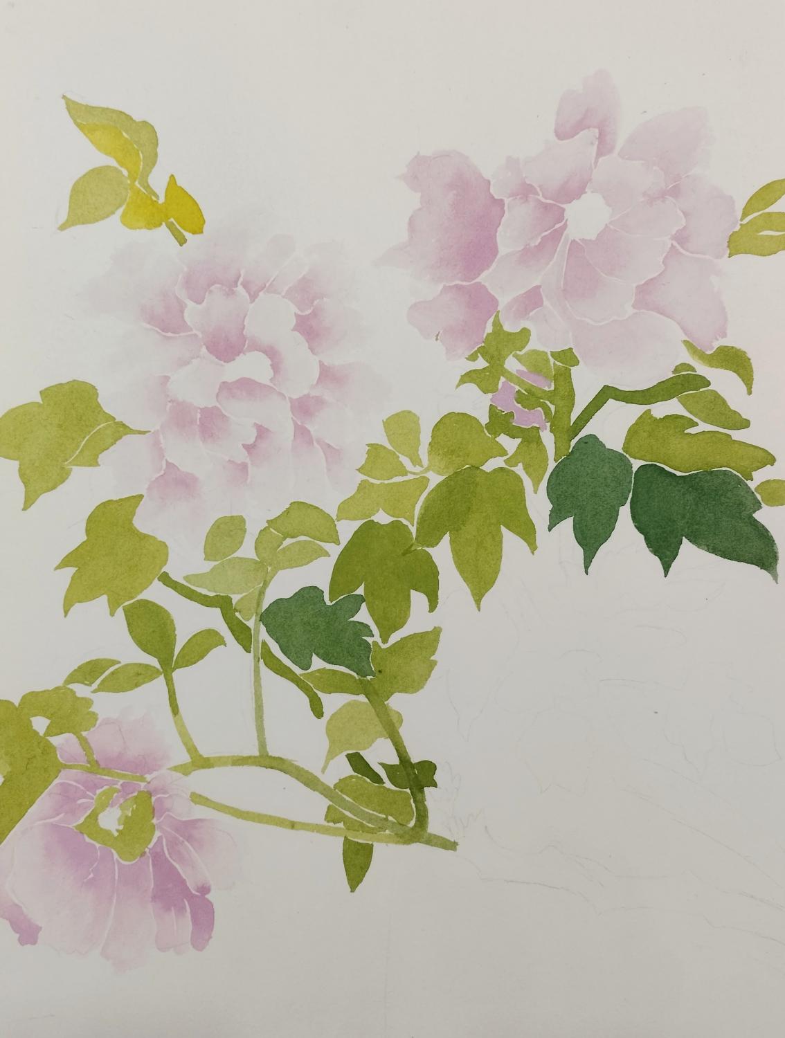 半成品,用没骨的技法进行设色,牡丹的颜色很清新,层次感很强,叶子的颜色变化也很丰富。