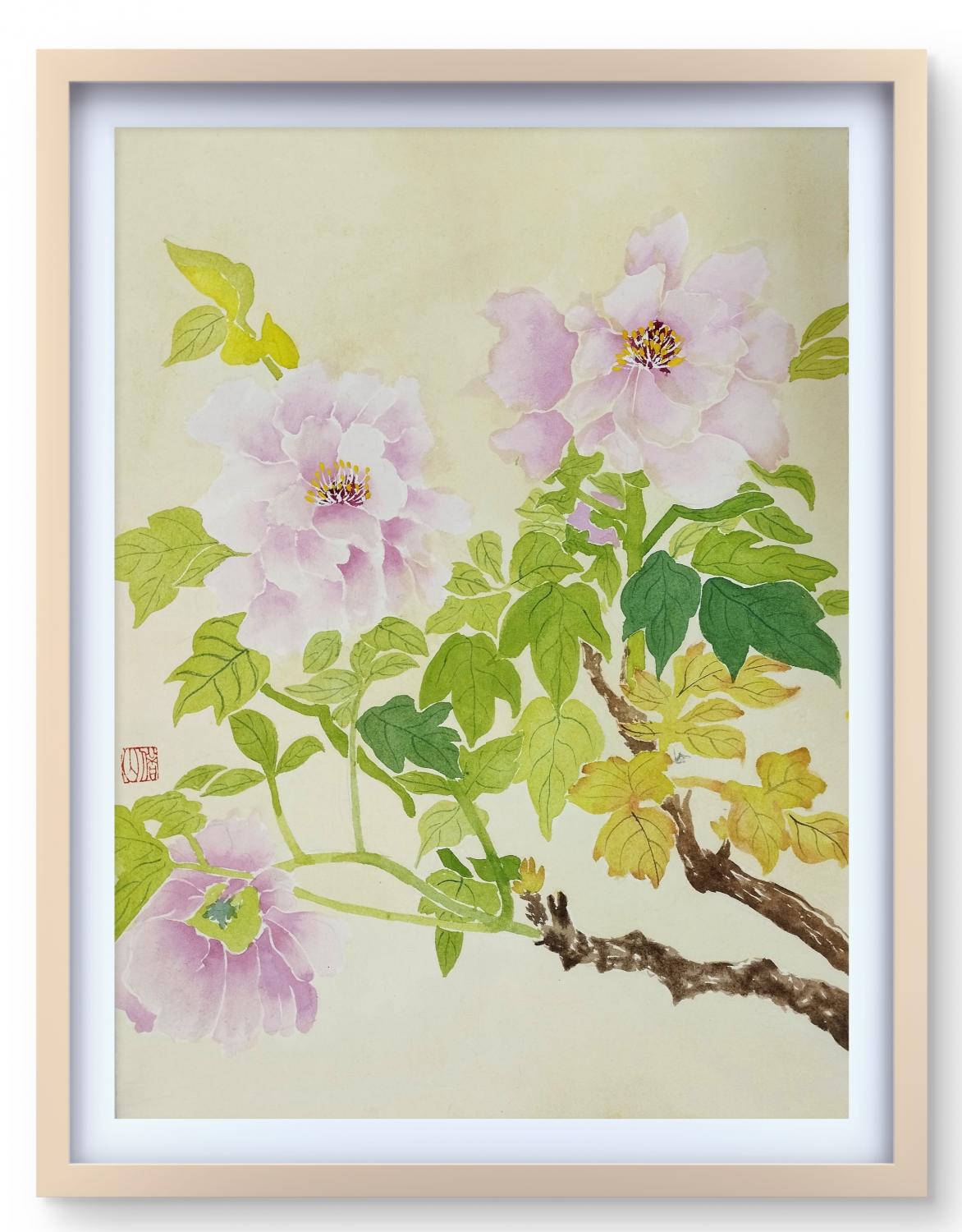 作品通过胭脂色系的多层晕染,自然呈现出花瓣的蓬松感与立体感,从花瓣边缘的淡粉到花心的浓粉过渡柔和,尤其两朵盛开的牡丹,花瓣层次丰富且不显杂乱; 叶片以不同明度的绿色(嫩绿、深绿)晕染,区分出叶片的老嫩与向背,黄色叶片的加入更添自然生态感;枝叶以淡米色底衬,进一步凸显了花叶的色彩层次,让主体更加突出,整体构图充满诗意的留白感。