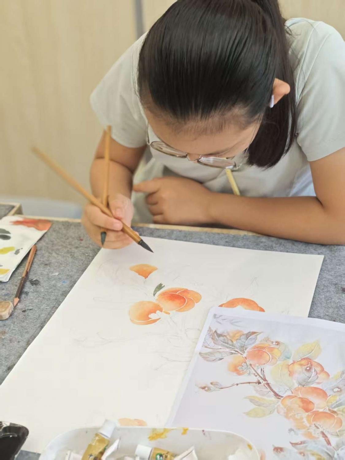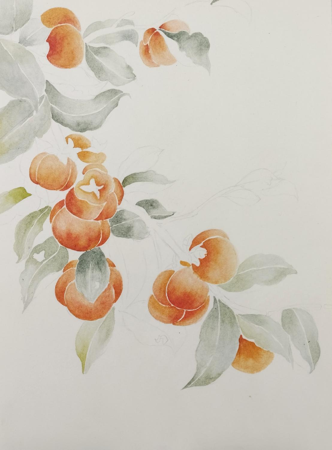 先看半成品,画没骨越来越熟练了,颜色的变化非常的丰富,包括叶子上的撞色有深浅的变化,以及一些泛黄的叶子,不同位置上的叶子会通过光有不同的颜色深浅变化,下节课我们可以加一些珠光颜料,丰富一下画面,让柿子看起来更饱满。
