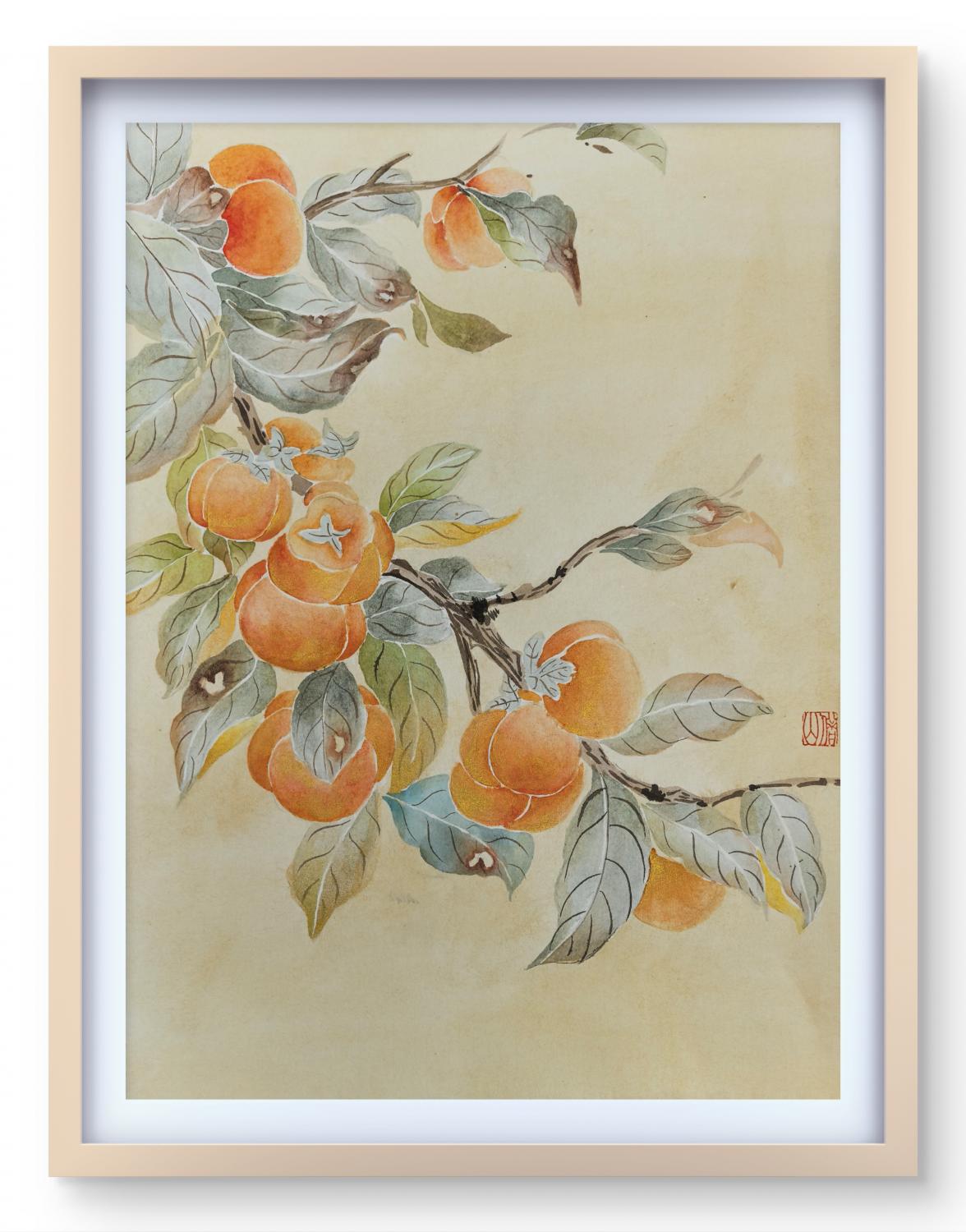 成品,用赭石加胶墨完成了树枝,部分树枝用了深浅的变化,看起来更有树皮的粗糙的质感柿子和叶子部分用了珠光颜料的金色在光的下面颜色变化的非常耀眼,有一种阳光照在狮子上金灿灿的感觉。