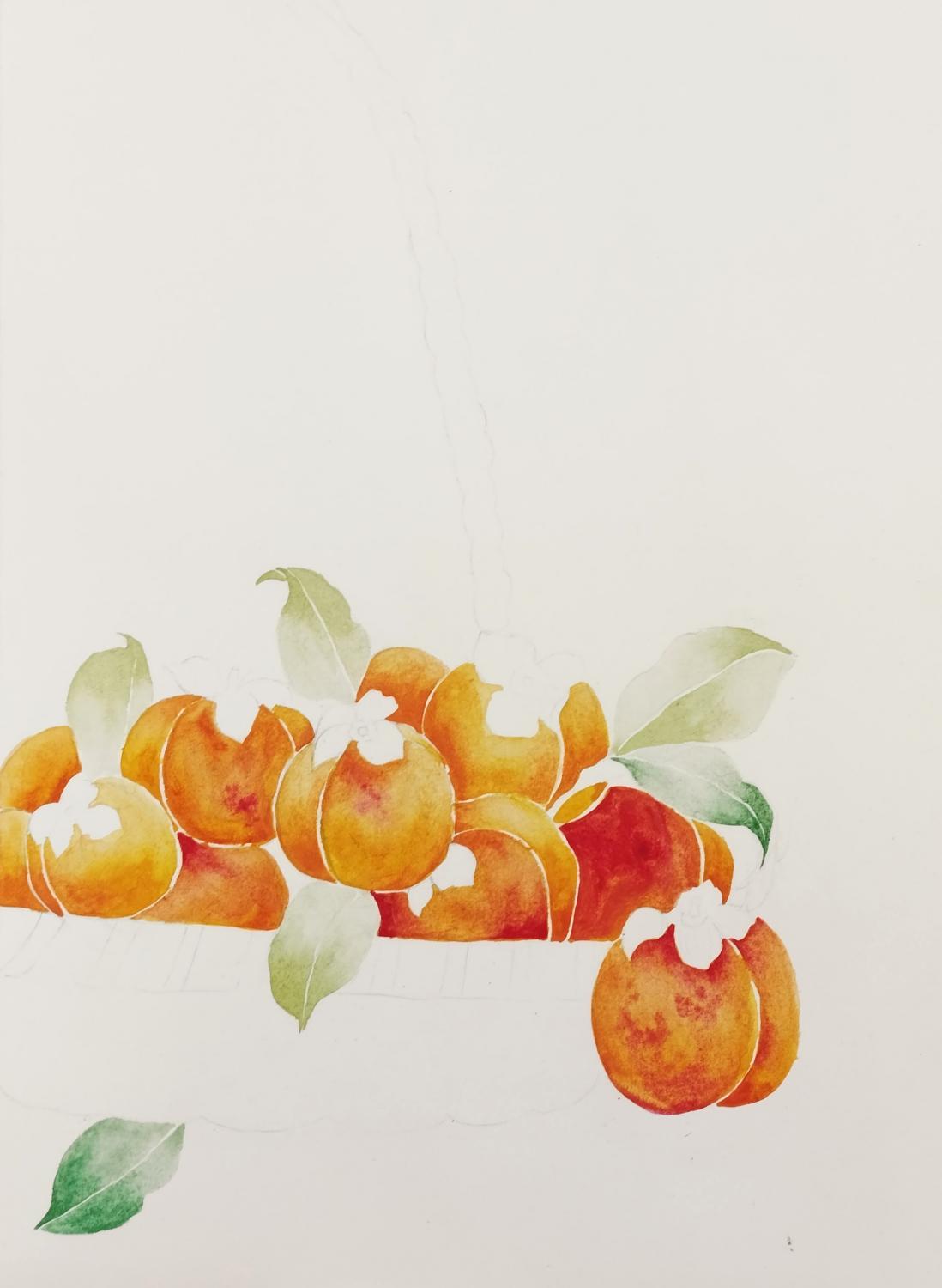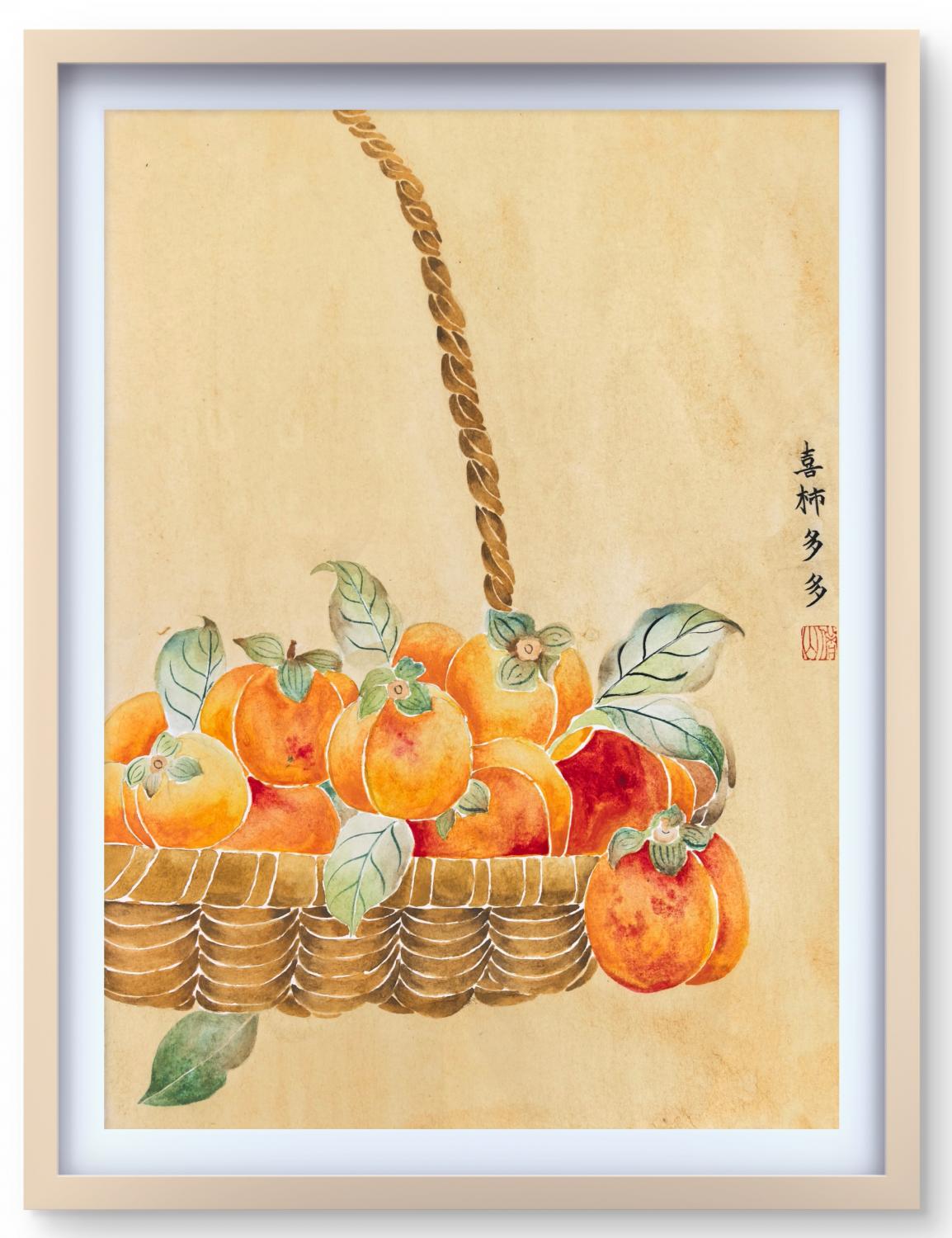 接下来,衣襟又选了一张关于柿子的,说可以凑成一对,构图是竹篮里面装着柿子,衣襟现在调柿子的颜色非常轻松哦。