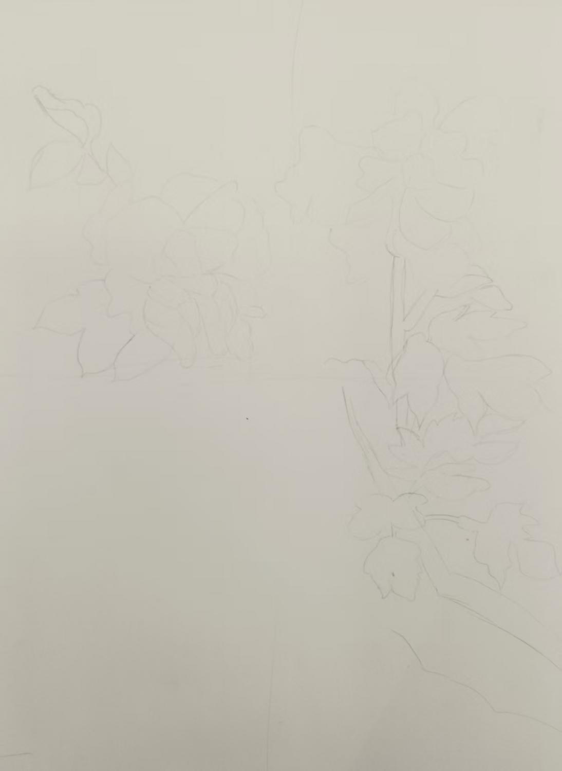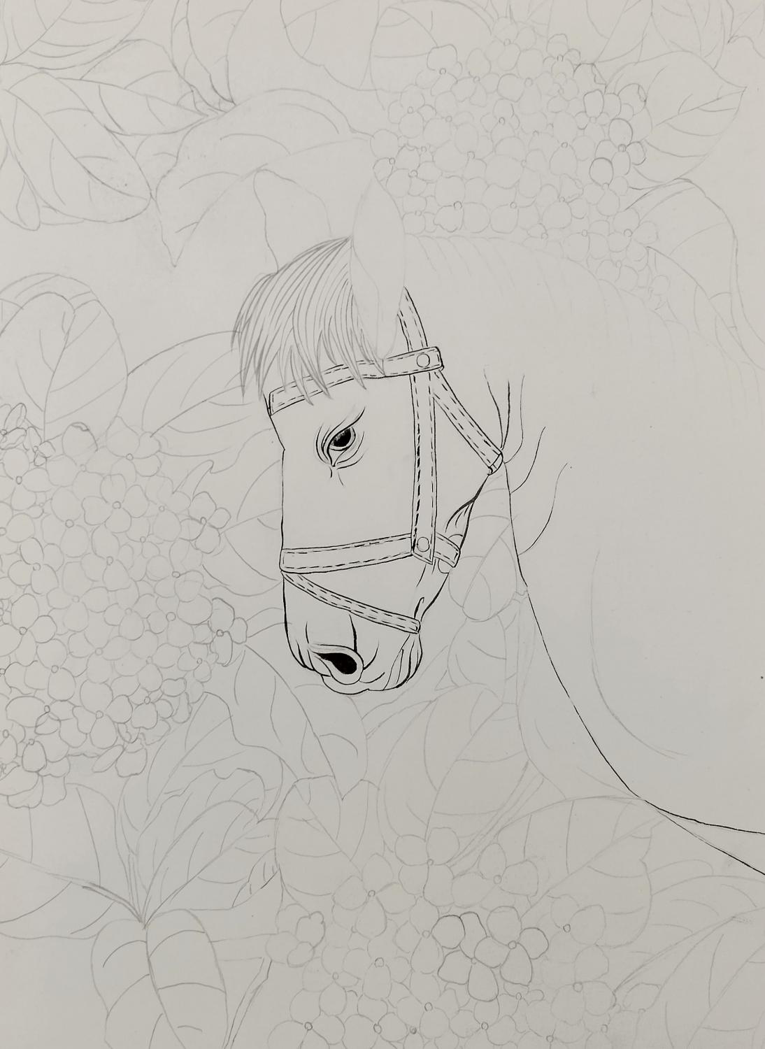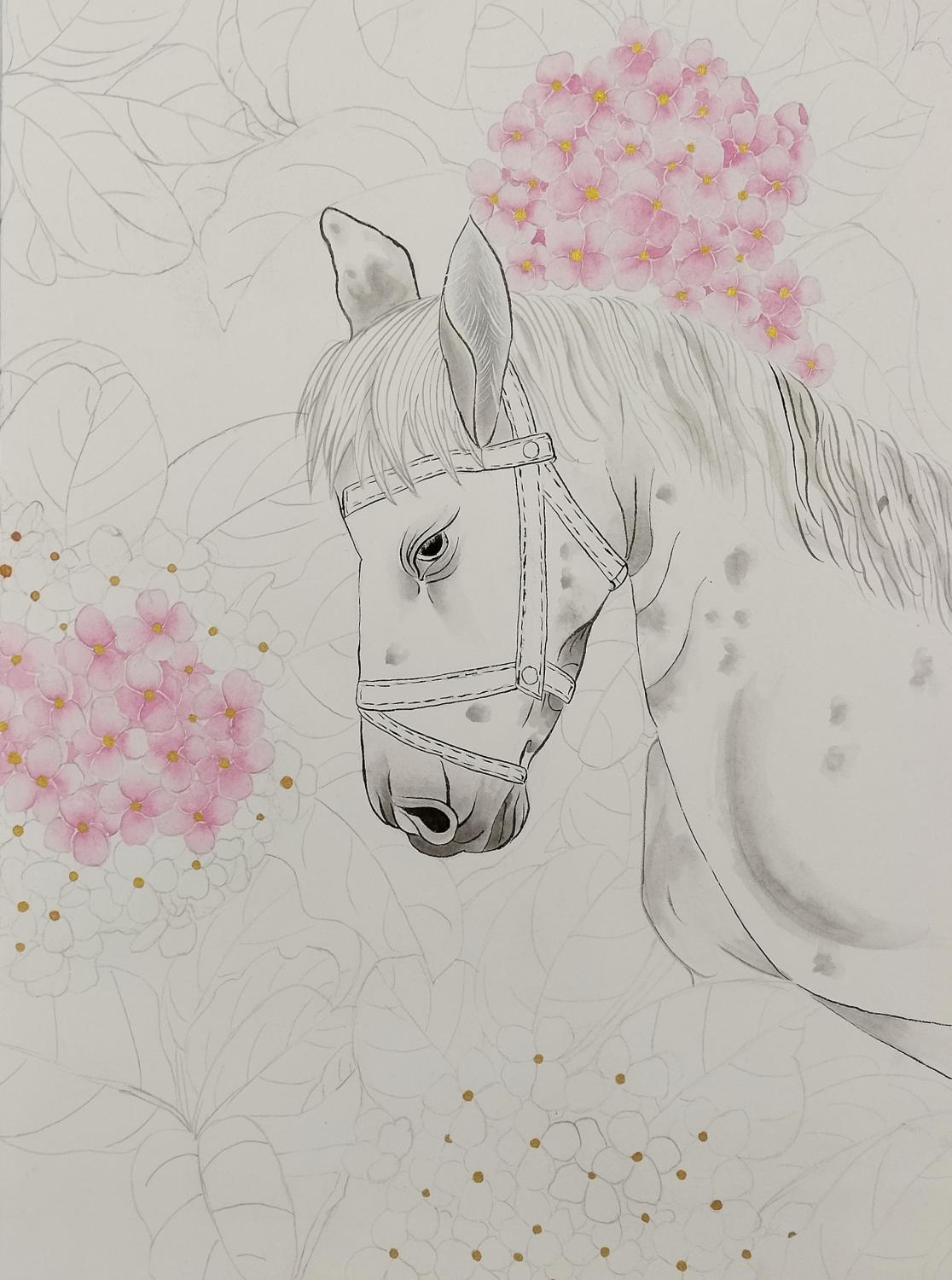 第二节课,主要用淡墨把马毛勾勒出来,画出它柔软的质感,用淡墨分散了皮肤部分的阴影部分,看起来更有体积感,后面的绣球花调出淡淡的粉色用没骨的技法进行分染上色,衣襟画的绣球花还是很好看,很清新哦,放完圣诞假后可以回来把背景和马的白色毛加上。