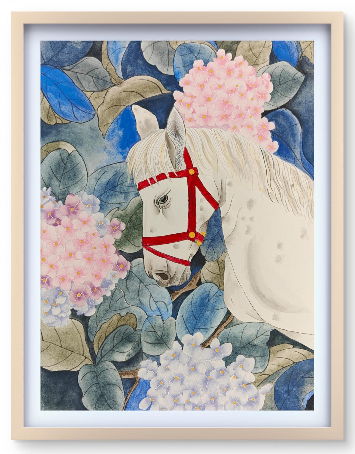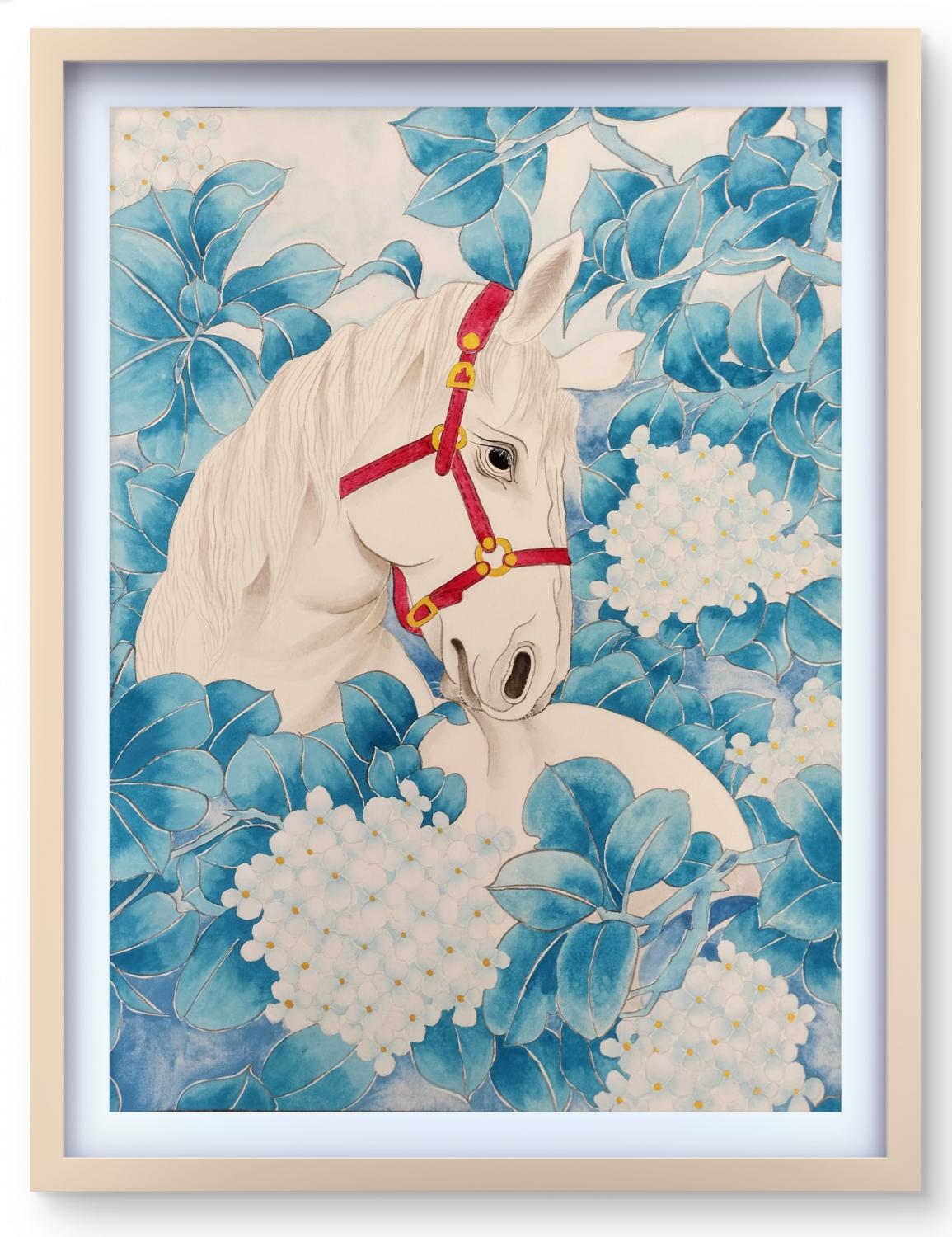 最后一节课,主要把枝干以及背景的颜色加上后,把前面的白马用淡墨进行分染,画出它皮肤的褶皱以及毛发的阴影,白马在叶子的衬托下更加凸显它的颜色,红色的缰绳让视觉中心一下子落在白马身上,整张作品给人的感觉神秘而又梦幻。