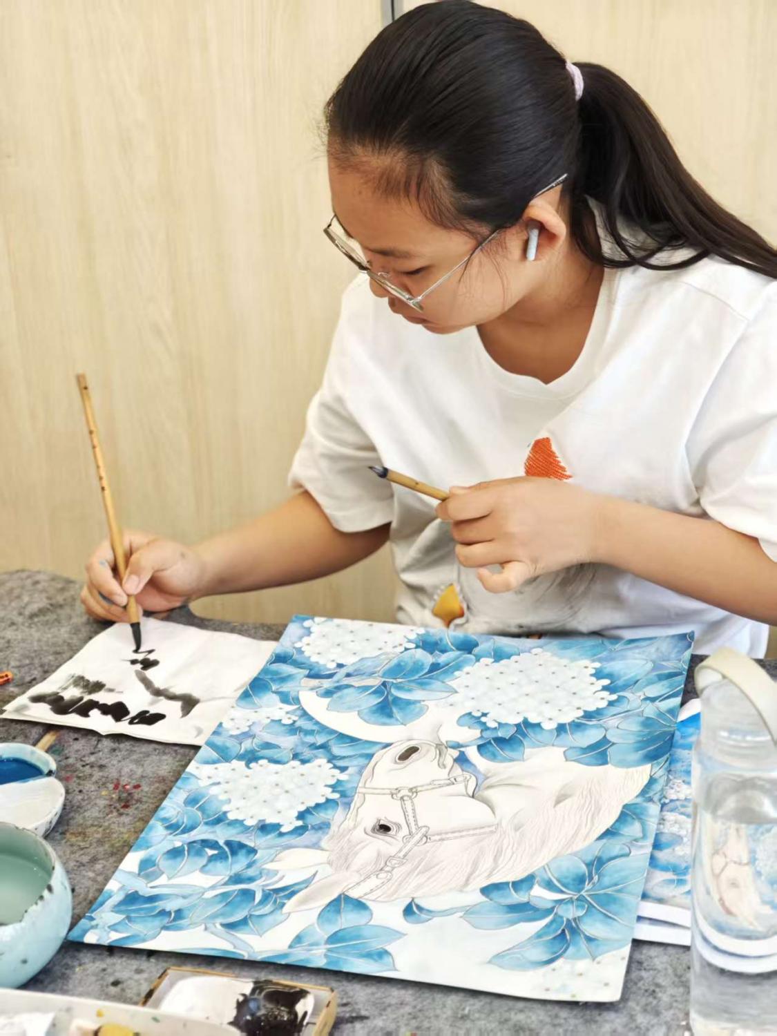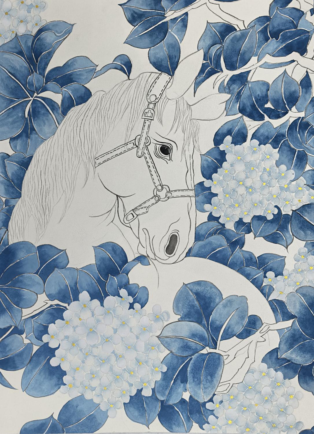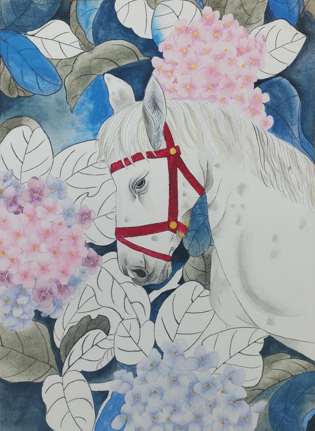 最后一节课,主要把所有叶子颜色上完,蓝色的叶子用群青和花青有深有浅,突出前面白色的马,让绣球的花更加立体。
