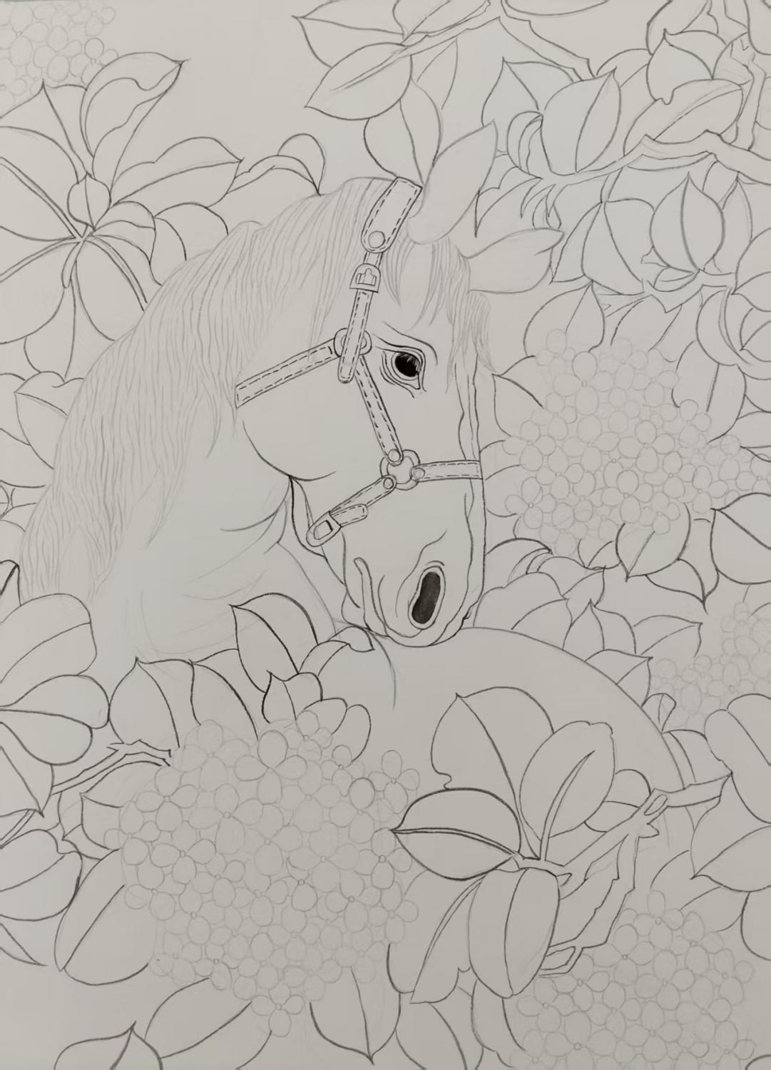 第一节课,画了一个马为主角的构图,正好是衣襟的生肖,后面的绣球花,下节课我们用没骨的方法画出来,今天画完后,我们用勾线笔重末勾勒出马的脸眼睛等,过淡墨勾勒了一下前面的毛发,白描的线条非常的精致,粗细变化很丰富哦。