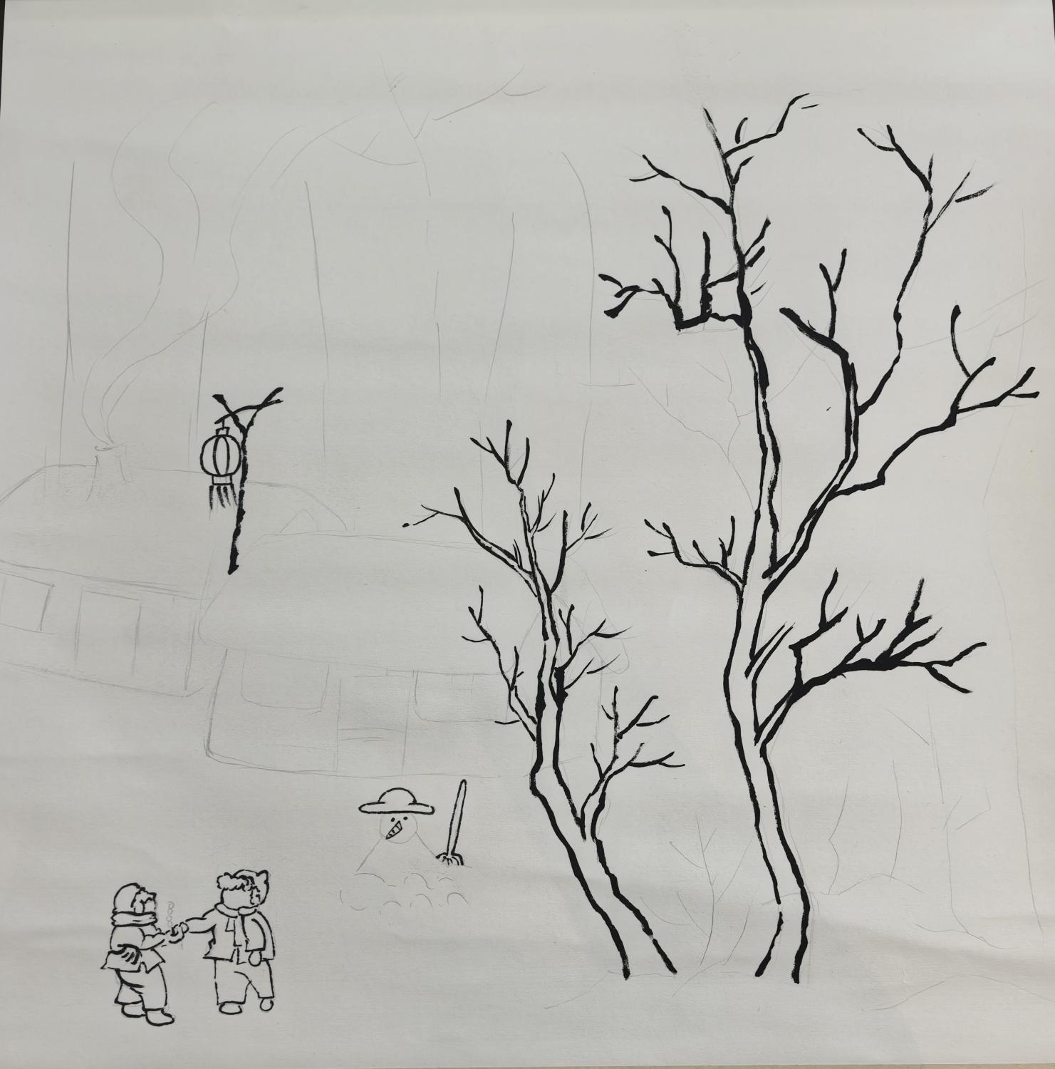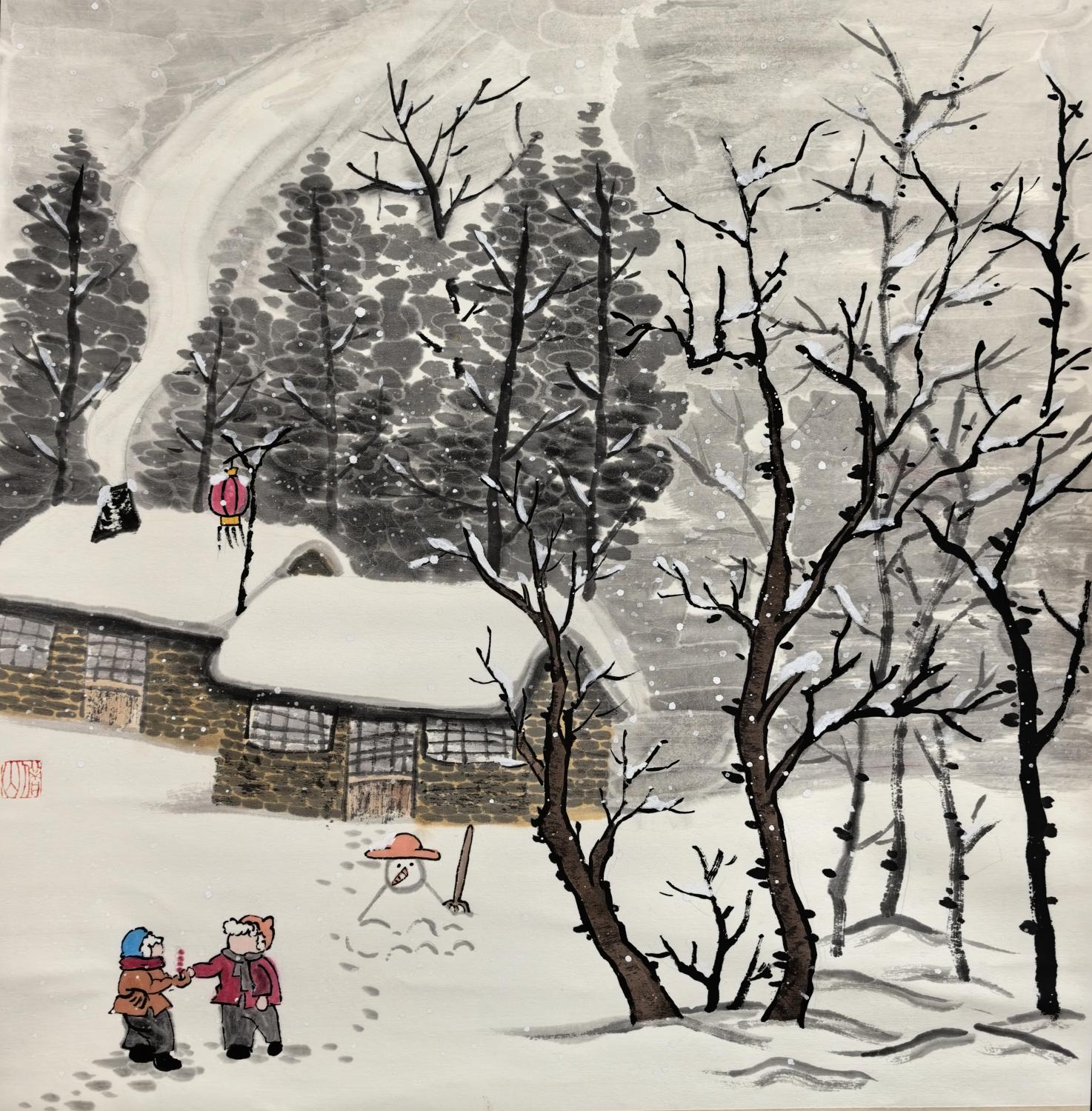 这张作品画面用大面积的白雪和墨色的树衬托冬日氛围,前面三棵树主要以重墨枯笔比为主,树干由粗到细的变化画的非常的精致,后面的数我们用中墨和淡漠点出它的松树的叶子,和前面的枯树枝形成鲜明的对比,拉开画面的空间感。前面两个小孩在雪地里面吃糖葫芦,堆雪人的场景下次就把人拉回了童年,这张作品后面染了淡墨有一些湿,所以我们下节课把雪加到树枝上后敲一些雪点。
