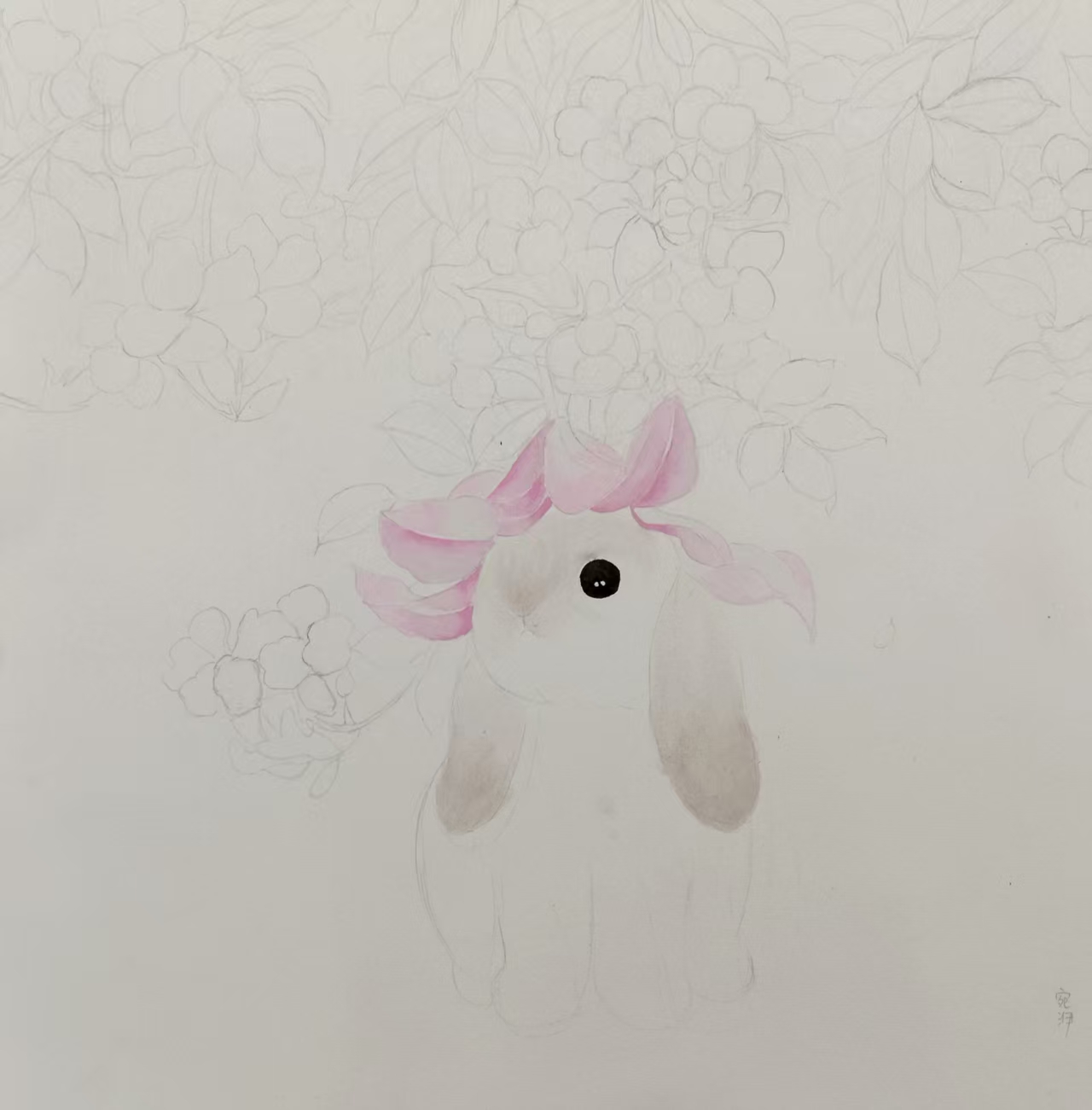 又起新篇,画的是一张非常可爱的作品,一只垂耳兔头上顶着一朵小花,倒扣在脑袋上,像一顶小帽子,上面也都是一簇一簇的花 ,画兔子的时候,我们后面会用到丝毛的技法哦,每根都很细致。