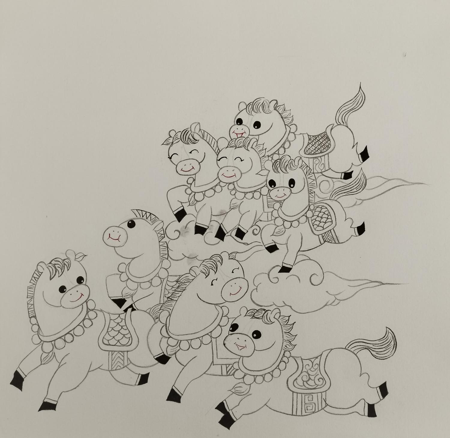 这幅八骏马画得也太可爱啦!线条特别流畅干净,每匹小马的表情都不一样,憨态可掬特别灵动,排列得错落有致,祥云搭配得也很有年味,整体构图饱满,线稿工整又讨喜,看着就喜气洋洋的。