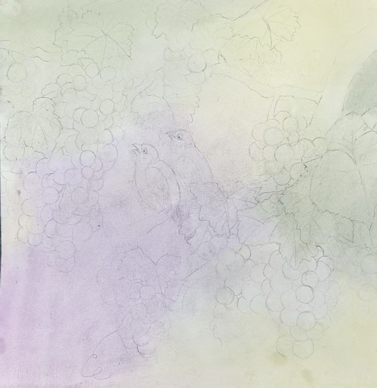 完工后的作品,葡萄的设色丰富且和谐,分染过渡自然,很好地表现出葡萄的晶莹饱满,尤其是前面深色和后面浅色的葡萄,层次分明,给人以视觉上的愉悦感。叶子的用色和勾勒也较为细致,叶脉清晰,体现出对叶片形态的细致观察。两只小鸟的造型生动,姿态自然,羽毛的纹理虽简约但能传达出质感,为画面增添了灵动的气息。整体构图疏密得当,葡萄、叶子与小鸟相互映衬,营造出一种生机勃勃的田园氛围。