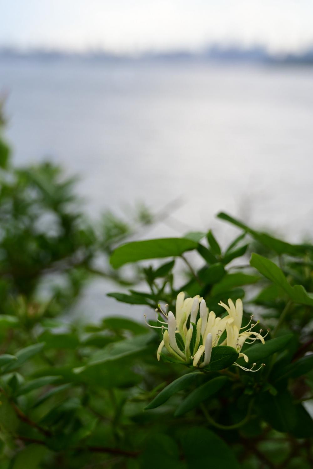 金银花,开得稀稀落落的,有一搭没一搭地,望着这片海湾。
