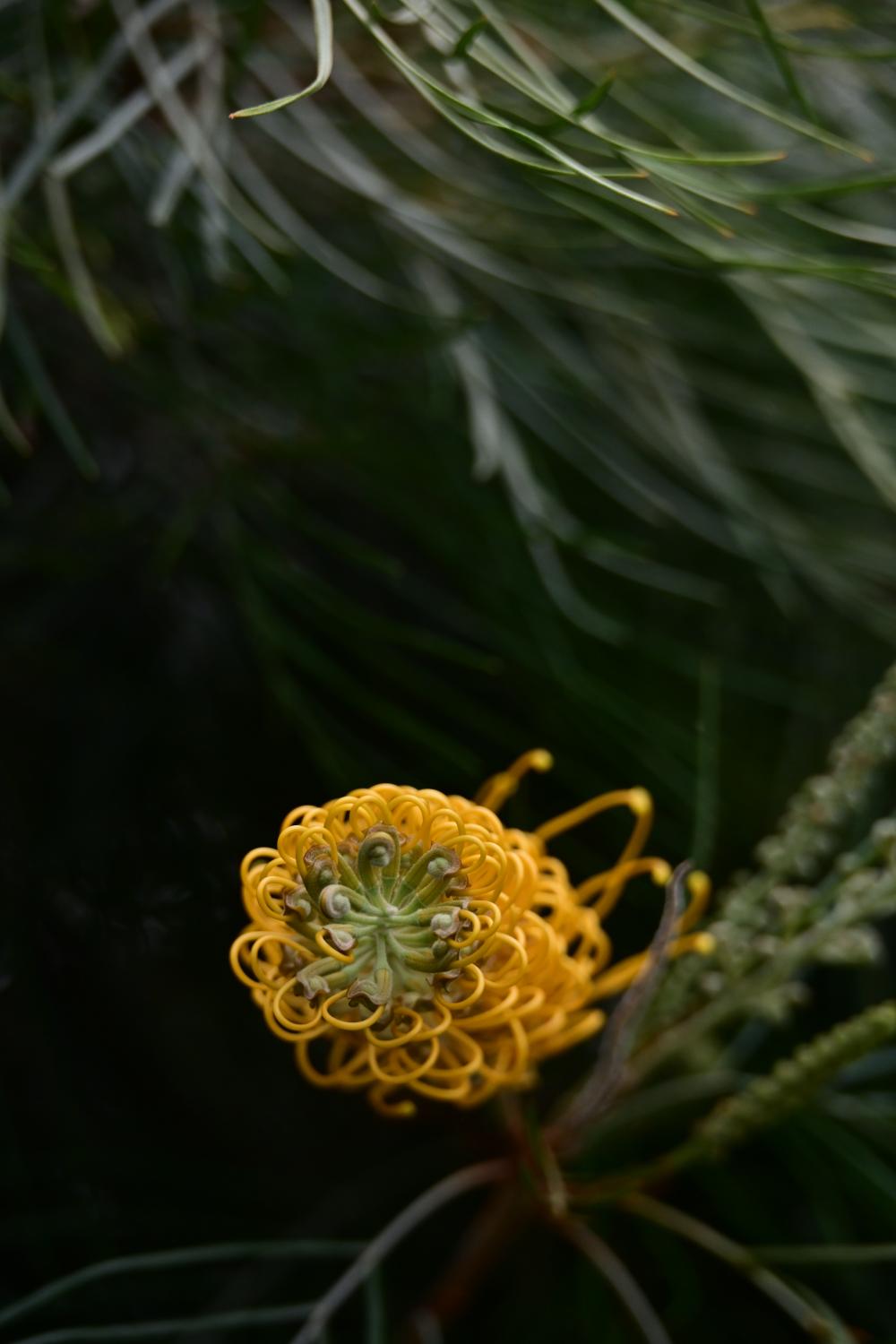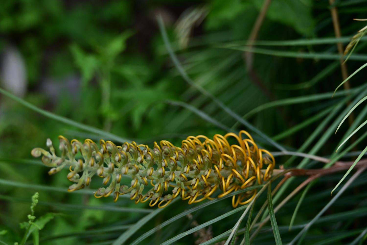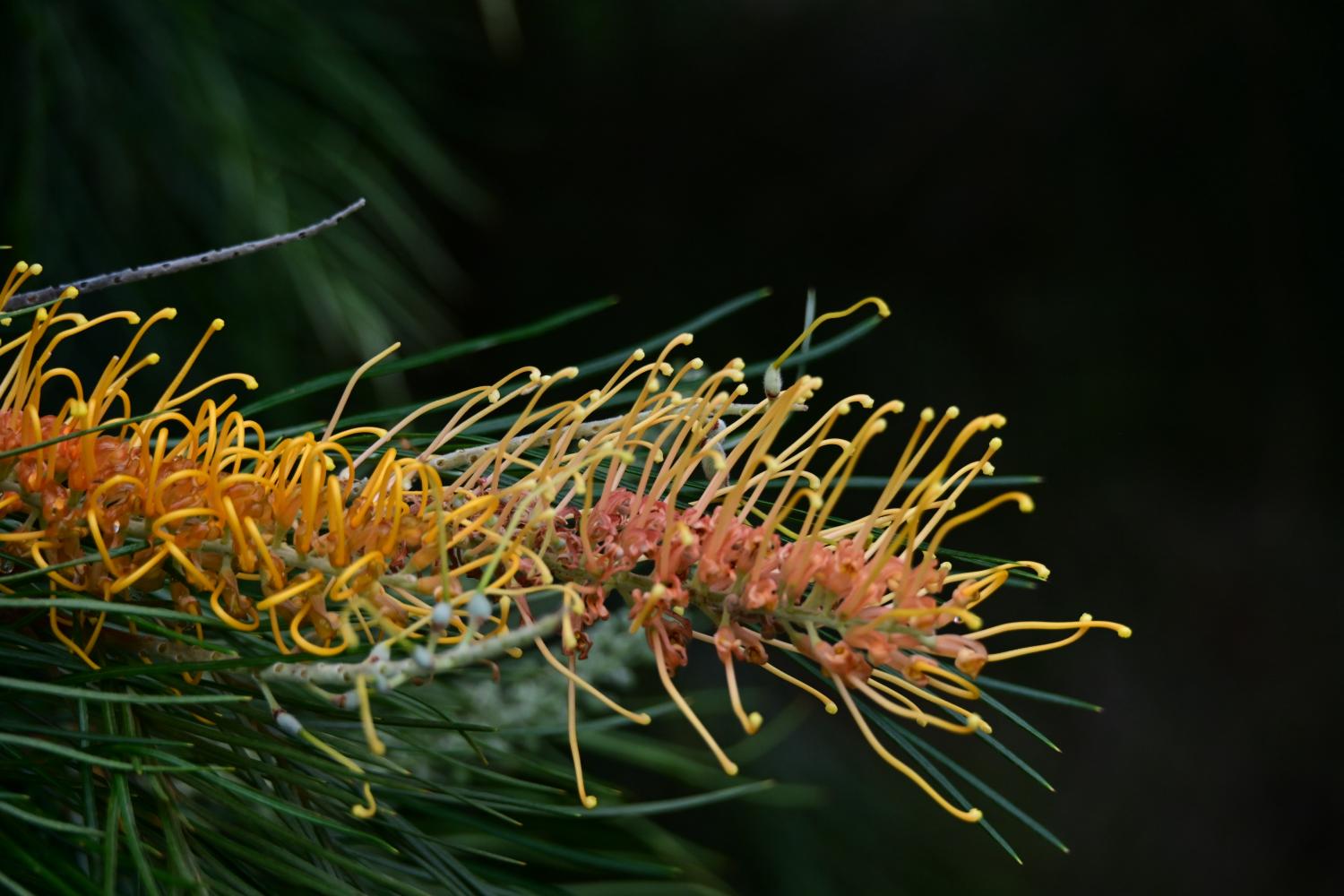 总状花序,花无花瓣,由大量细长的金黄色花丝组成,像一把把 “毛刷” 或 “蜘蛛腿”,这是银桦属植物的标志性特征。