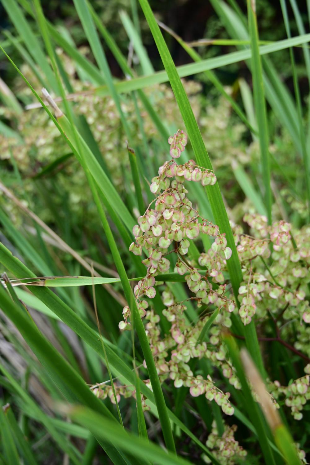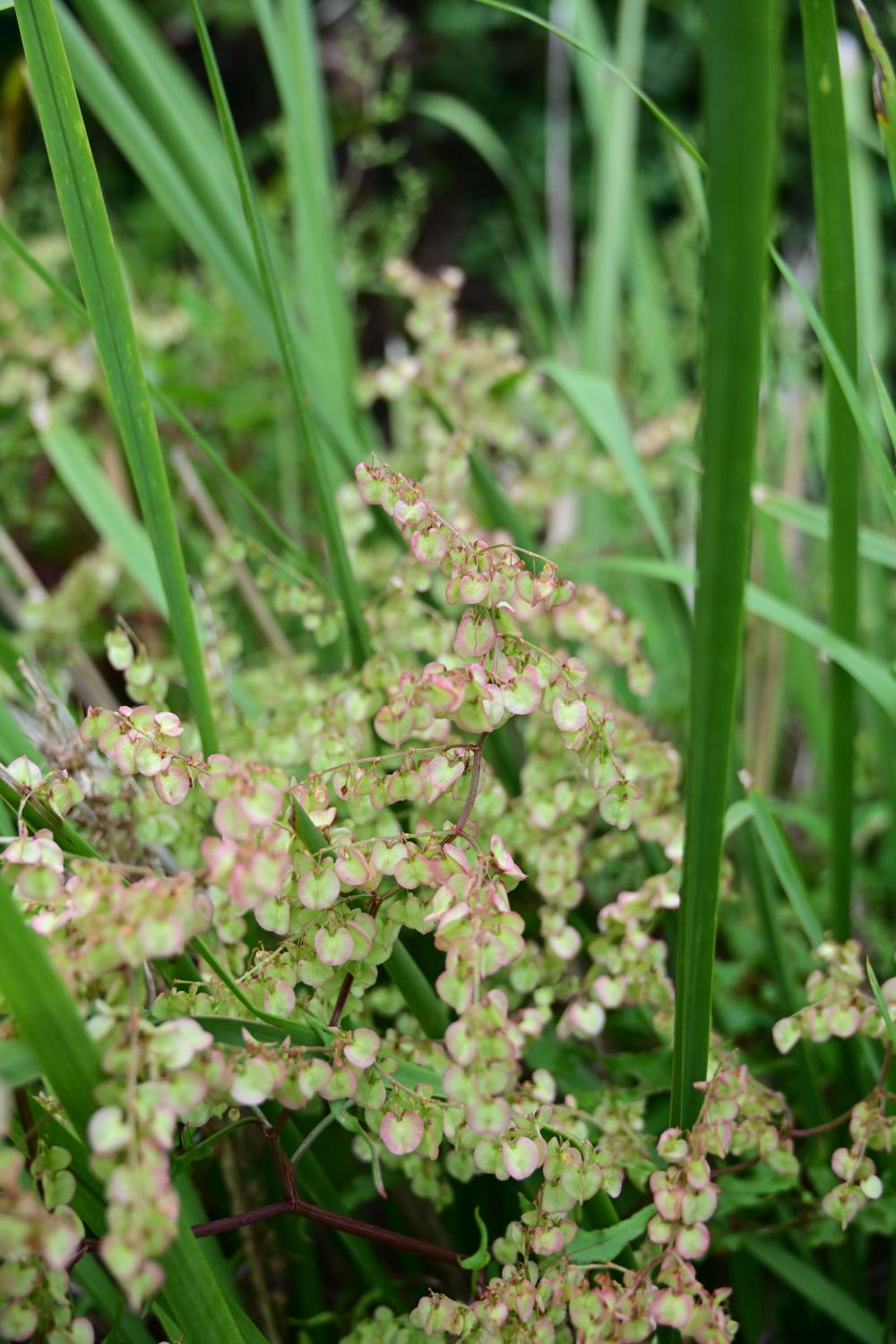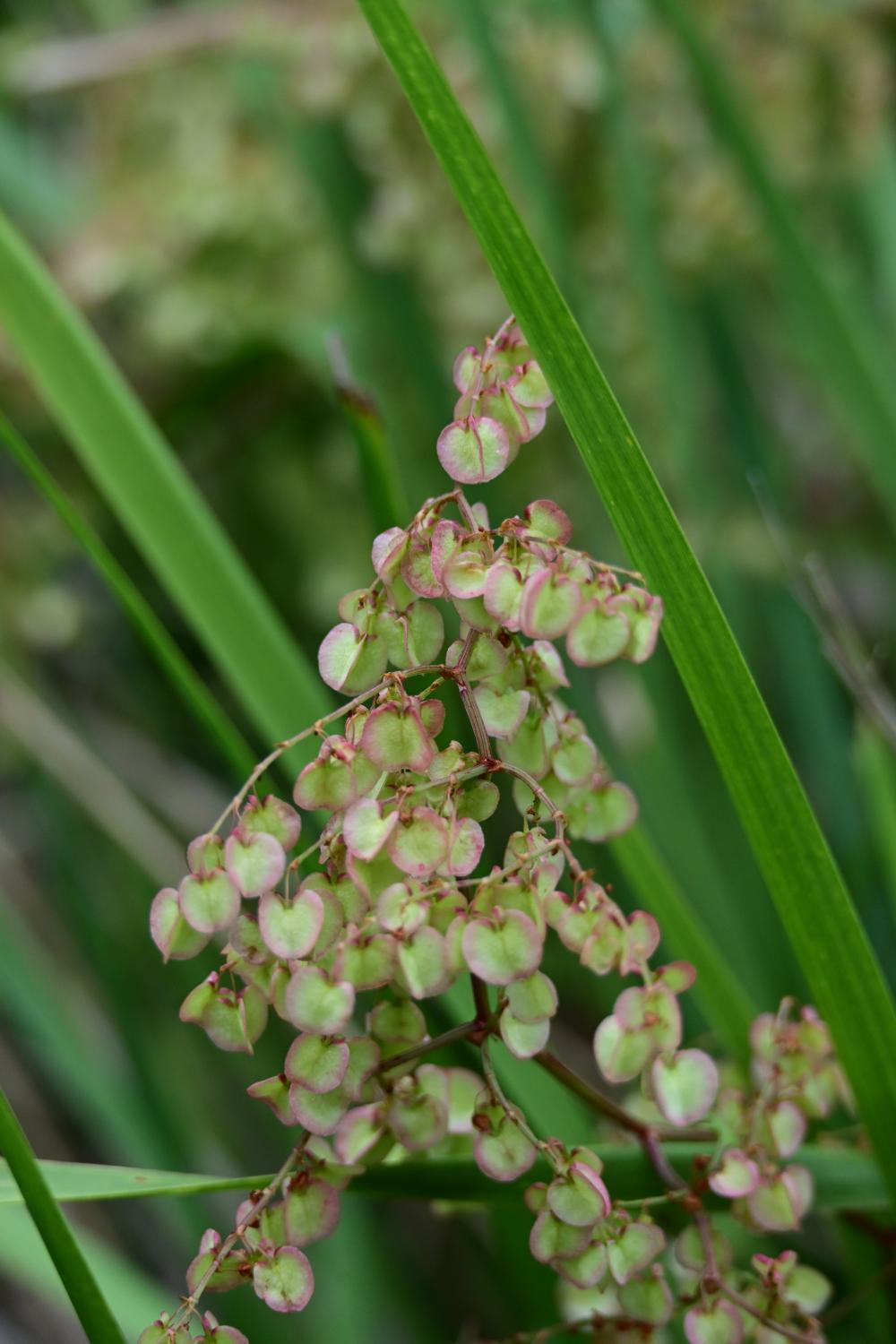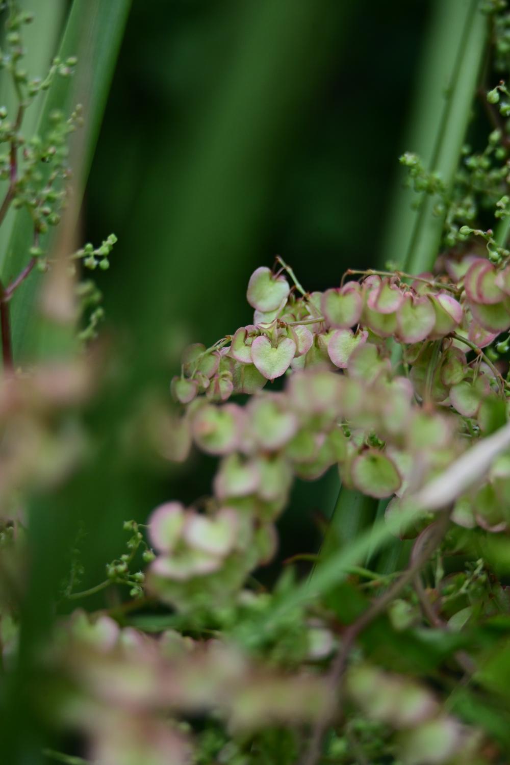 粉绿色、心形的小 “叶片” ,其实是箭叶酸模的果翅,内轮花被片在结果时膨大而成,颜色从绿色逐渐变为粉红或深红色。