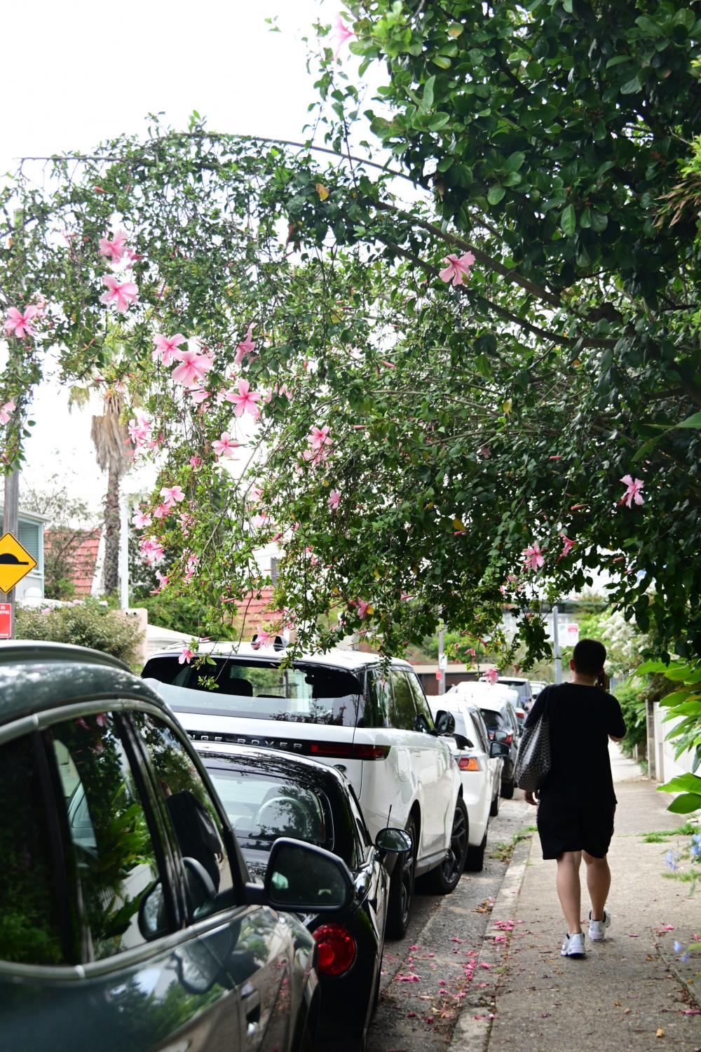 在小巷中绕,寻找车位的同时,也经过一些花树,从人家的院子里伸出来。