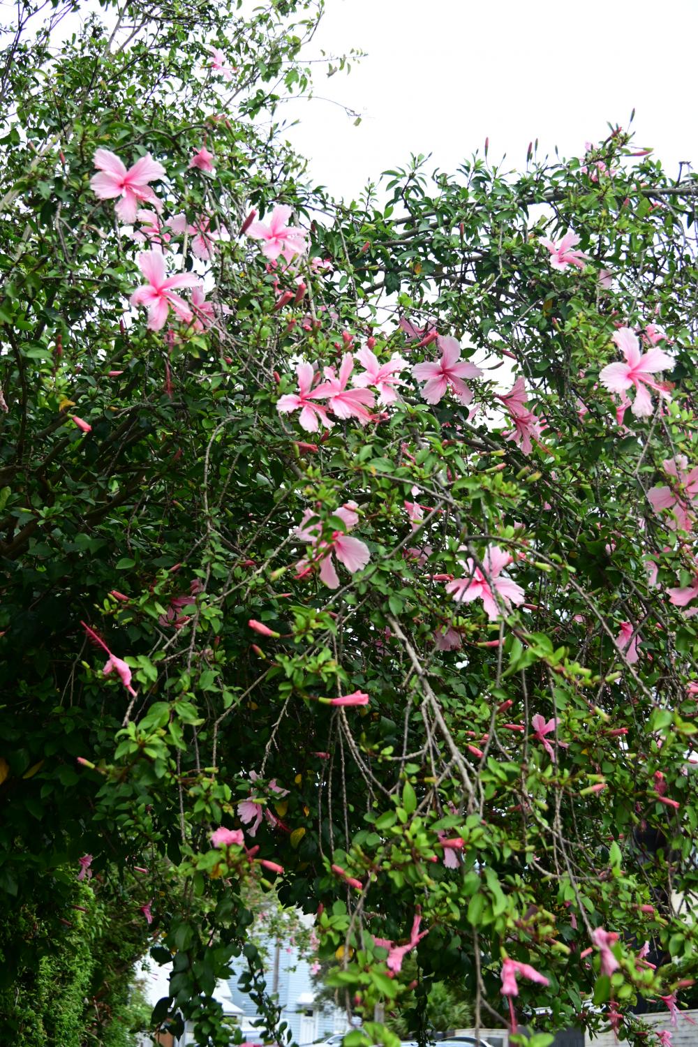 在这里,扶桑的垂枝品种很常见,伸着长长的枝条,开着大朵大朵的花。