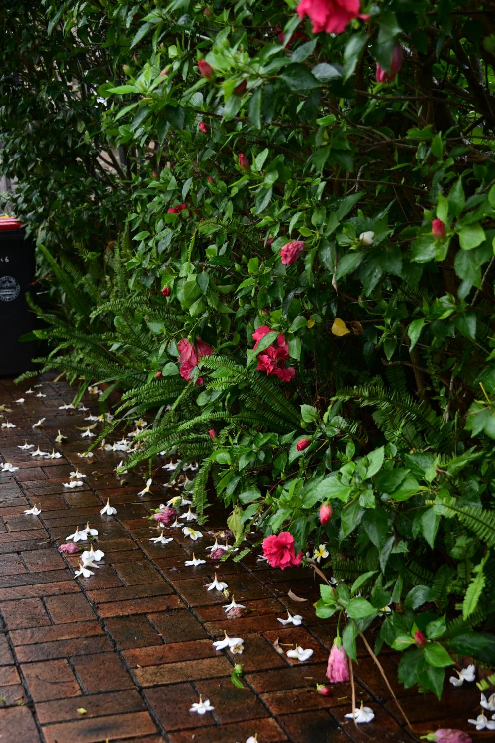 雨后的落花遍地,依然是以鸡蛋花为主。