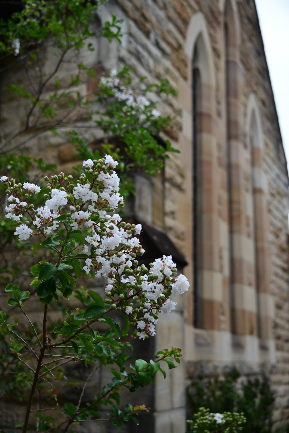 以教堂建筑为背景,拍下的紫薇,好看了许多。
