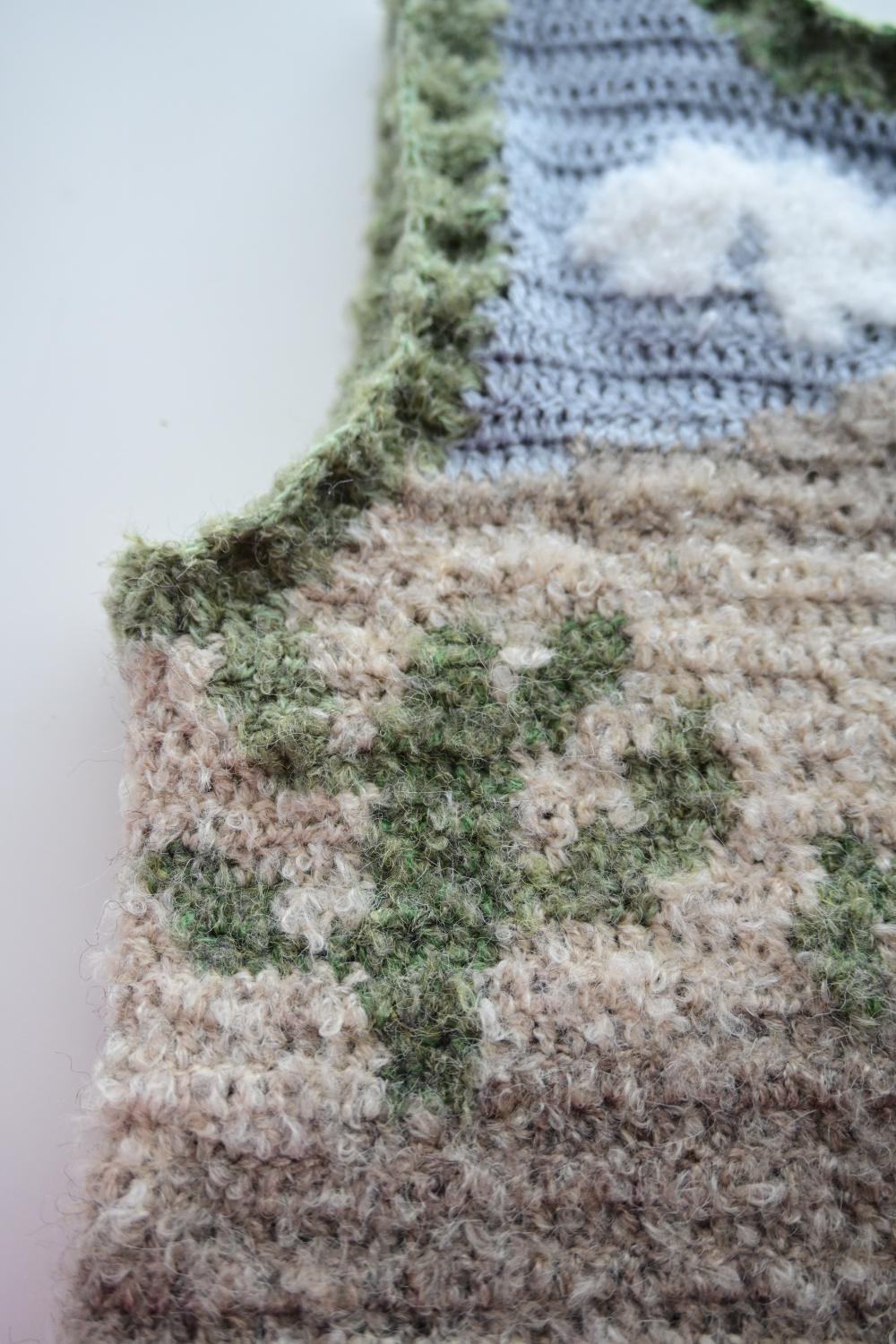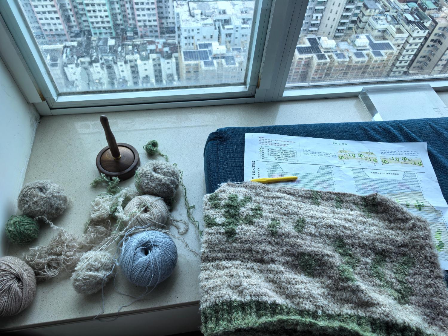 多个月前即动手钩织,钩完底边后发现按原设计的钩针型号钩出来的成品太宽了,加之另一件已经钩完的马甲在缝制时发现控制了宽度就丢失了长度,信心严重受挫,于是将这一条底边搁置一旁,直至春天快过完了,这才攒足勇气重新来过。