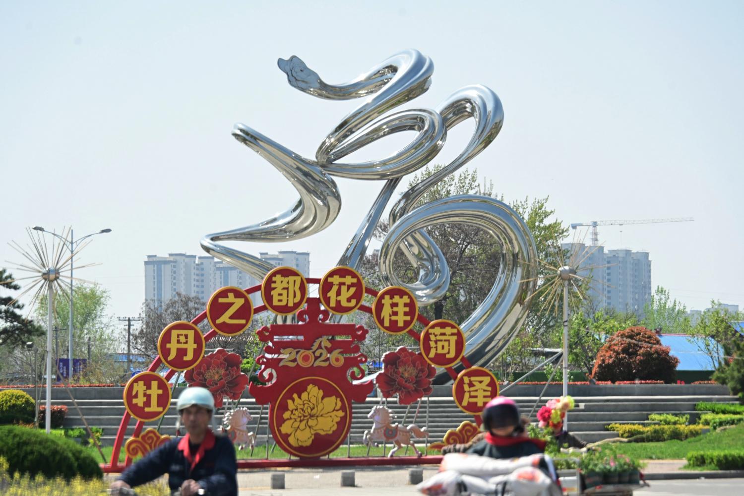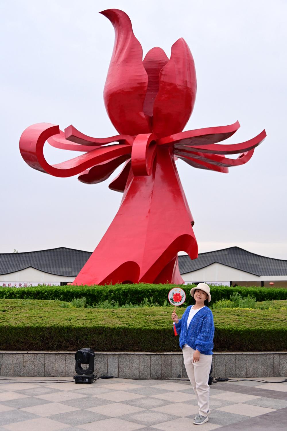 走到一处广场上,巨大的一朵,也是牡丹,名为“国花魂”,是菏泽牡丹文化的象征雕塑之一。