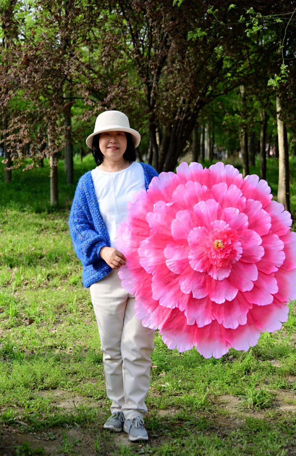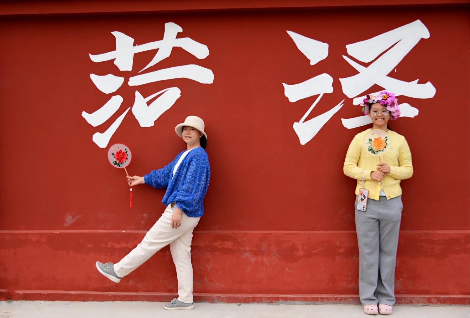 迎面走来的游客手中撑着一把牡丹花伞,觉得太形象太喜庆了,厚着脸皮借来一用,不用自己再买了。