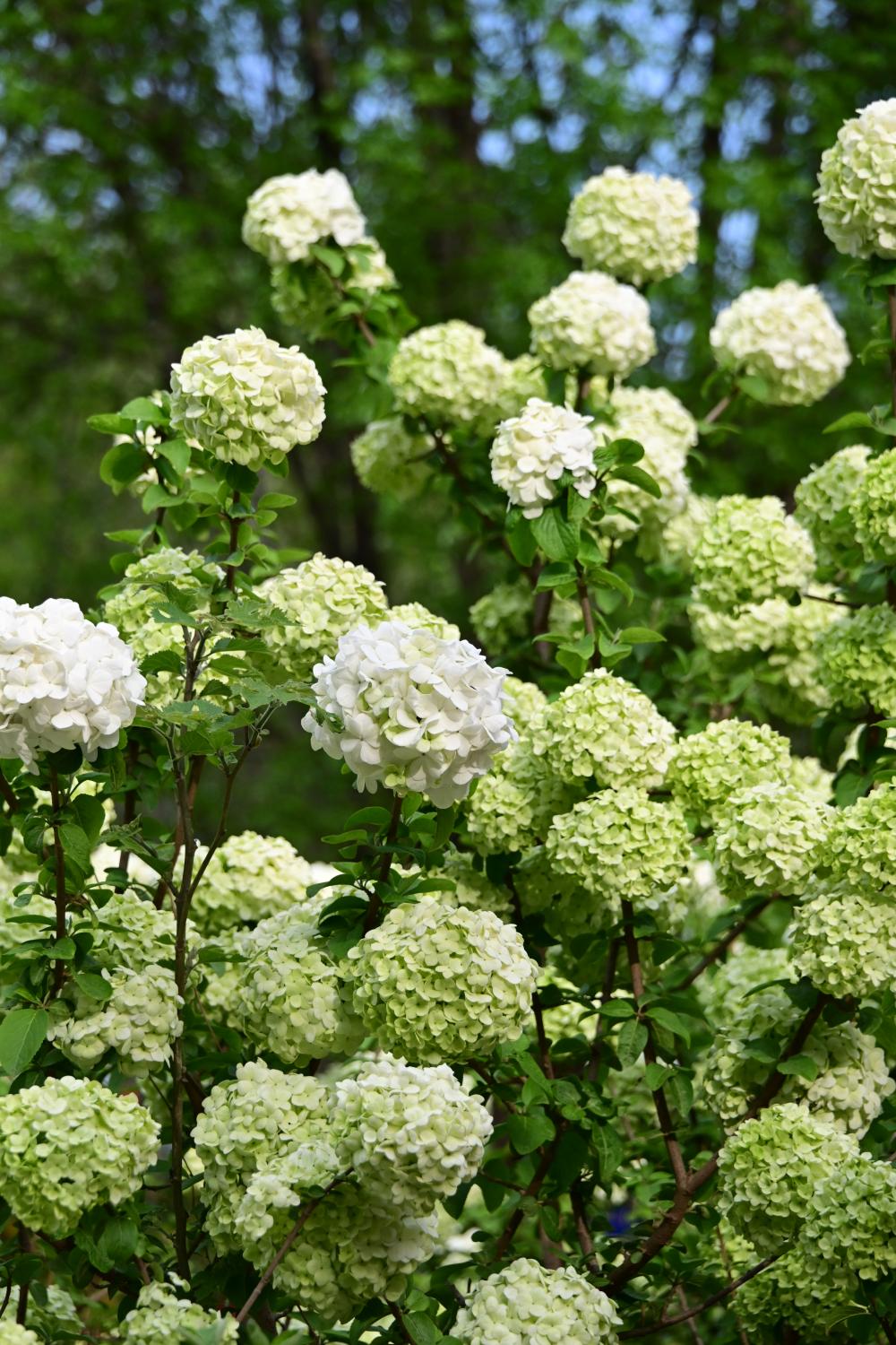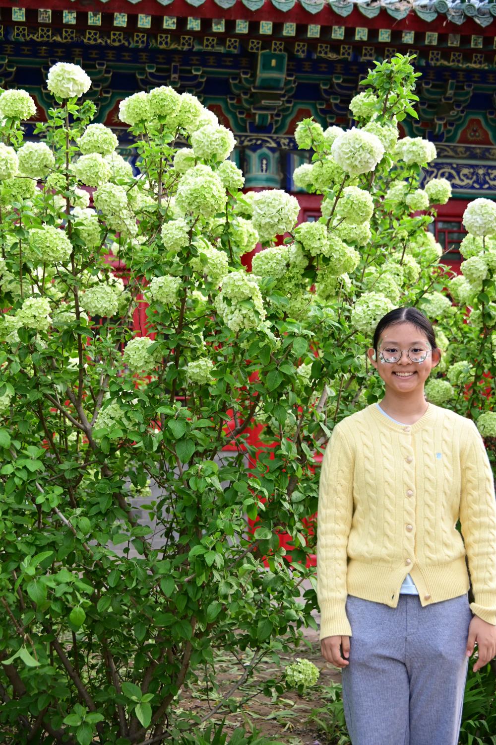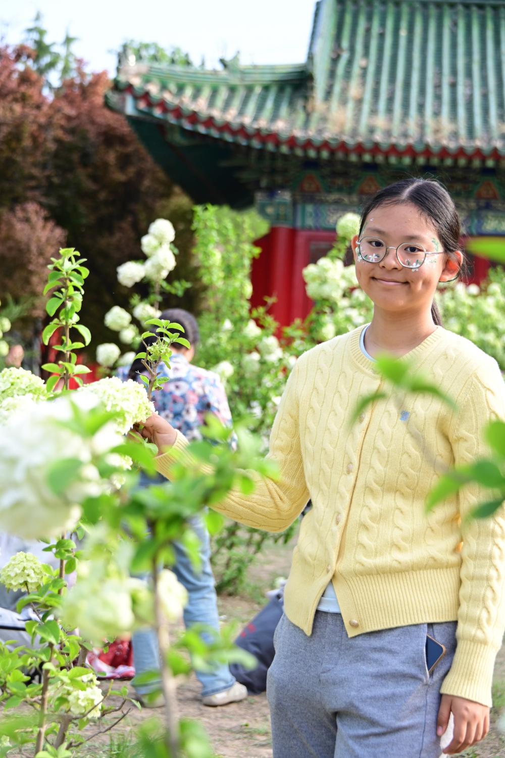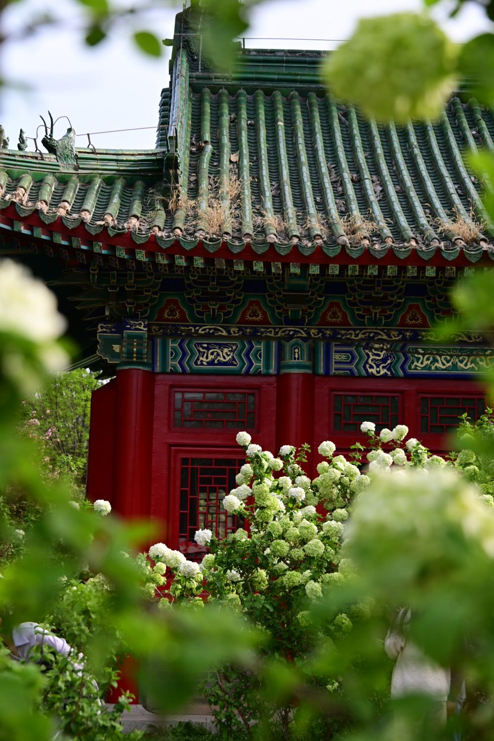 到了百花园中的国风院,仿古的建筑前面,盛开着又高又大的绣球。