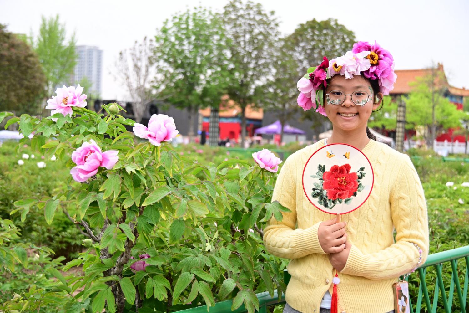 光看不够,还买了一把绣着牡丹的扇子,一边走一边摇。