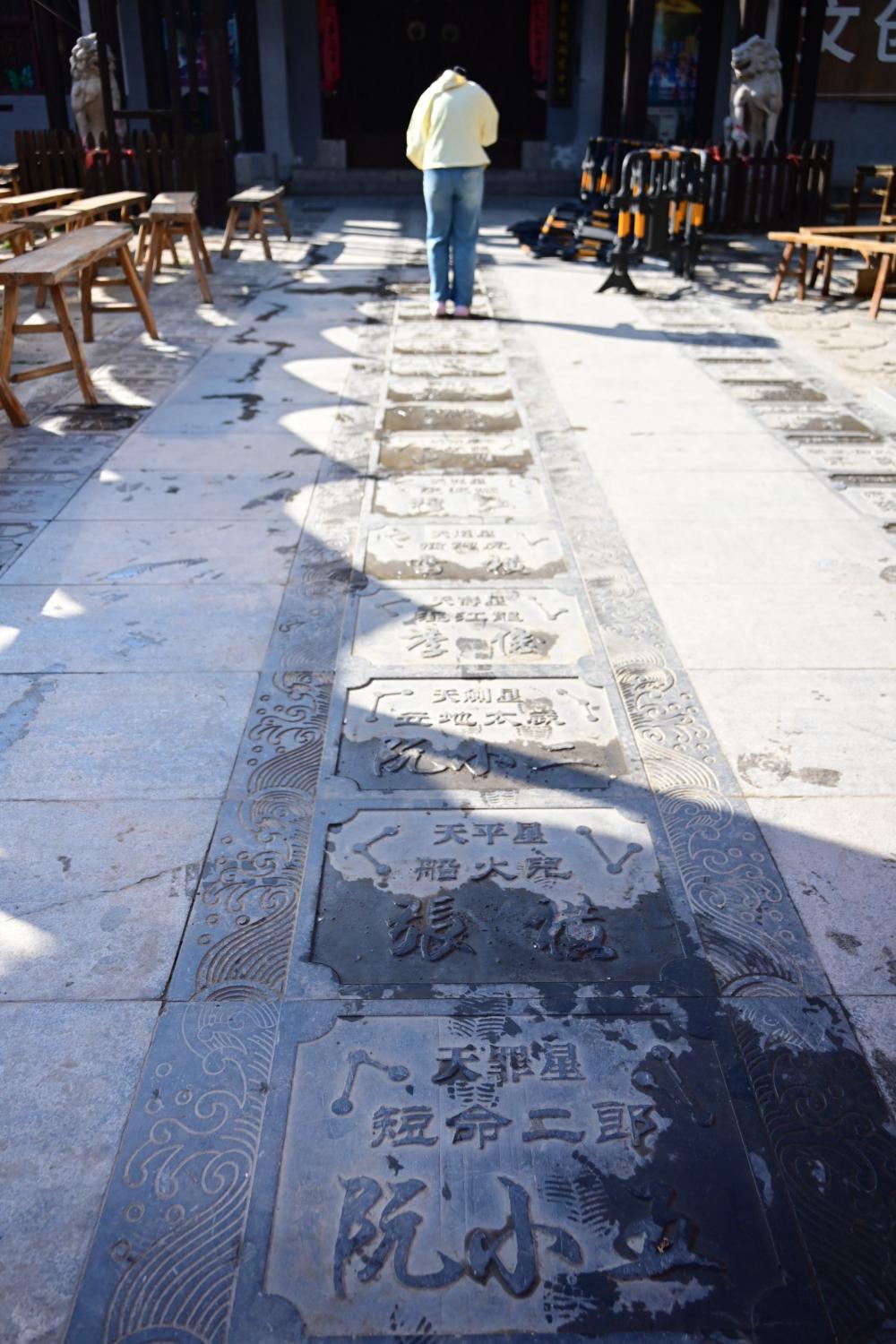 忠义昭彰牌坊上面的空间些许开阔,发现石板路上刻着《水浒传》中三十六天罡星的人物信息,每一块石板对应一位梁山好汉。估计还会有七十二地煞,只是我们没有经过。