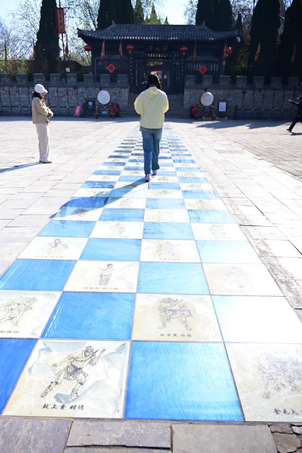 蓝白相间的棋盘式地砖上,刻着《水浒传》108位好汉的线描画像与绰号,比如鼓上蚤时迁、白日鼠白胜、母夜叉孙二娘等,完整还原了梁山好汉的人物群像。这些人物信息都是刻在白色的砖上,蓝色地砖则是空的,仅作为间隔,象征水泊梁山的 “水泊”,和人物砖交替排列,寓意 “从水泊走向山寨”,每走一步,就像 “结识”了 一位好汉一样,仪式感十足。