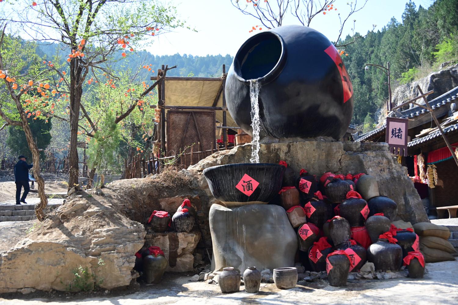 酒店前是巨大的 “酒坛流水” 装置,还原了《水浒传》里朱贵酒店的场景,周围的酒坛、“赌” 字招牌、仿宋建筑,都是为了还原北宋市井里 “大碗喝酒、大块吃肉” 的江湖氛围。