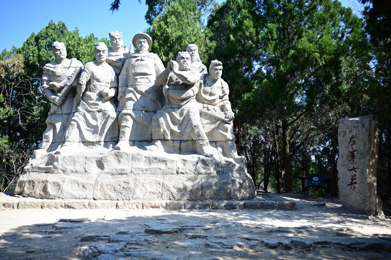 左寨七英雕像, 刻画了镇守左军寨的七位头领,分别是:豹子头林冲、九纹龙史进、云里金刚宋万、摸着天杜迁、赤发鬼刘唐、病关索杨雄、拼命三郎石秀。
