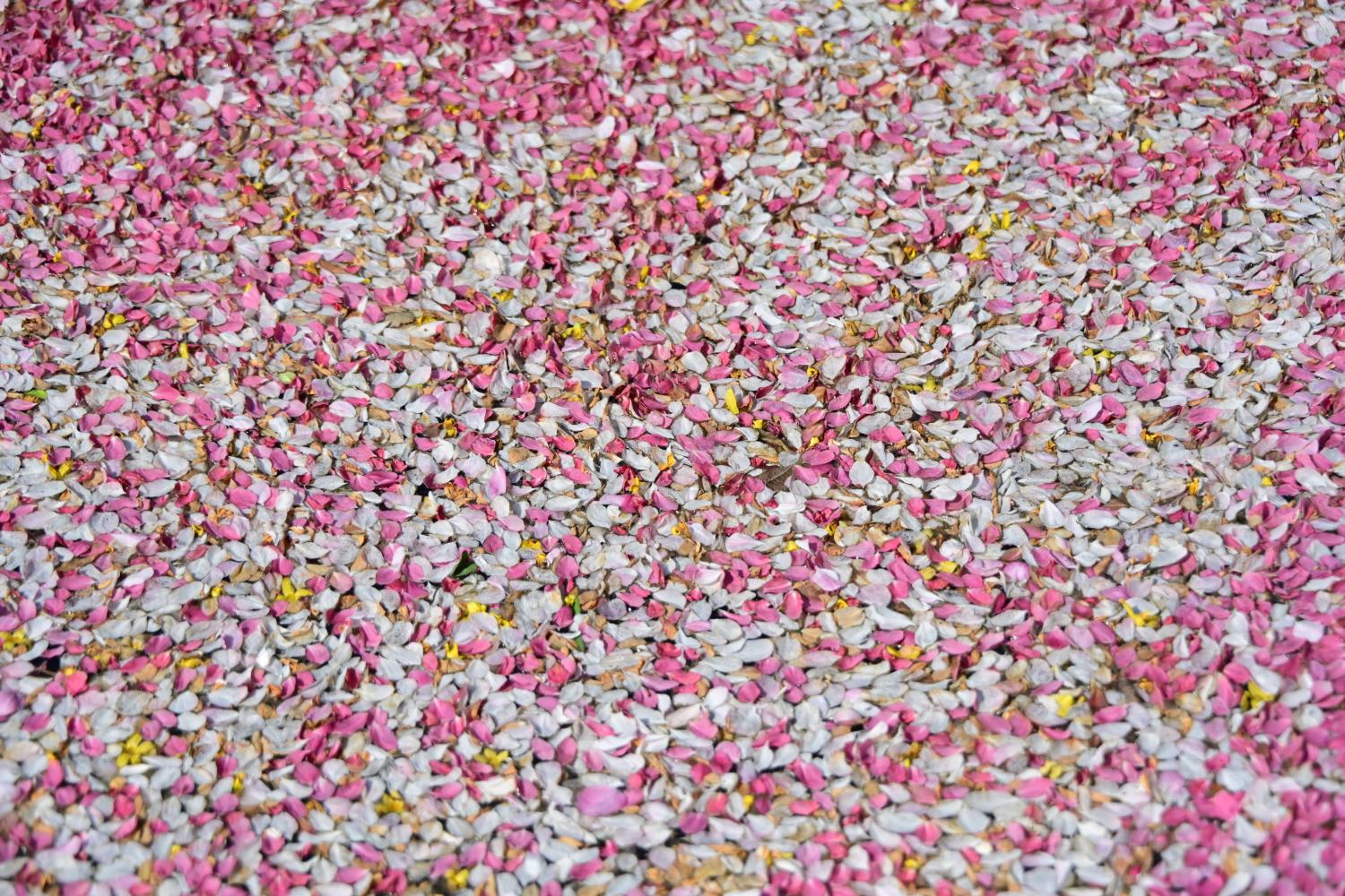 水面上,铺着满满一层花瓣,微风吹过,花瓣还在持续飘落,如入梦中仙境。