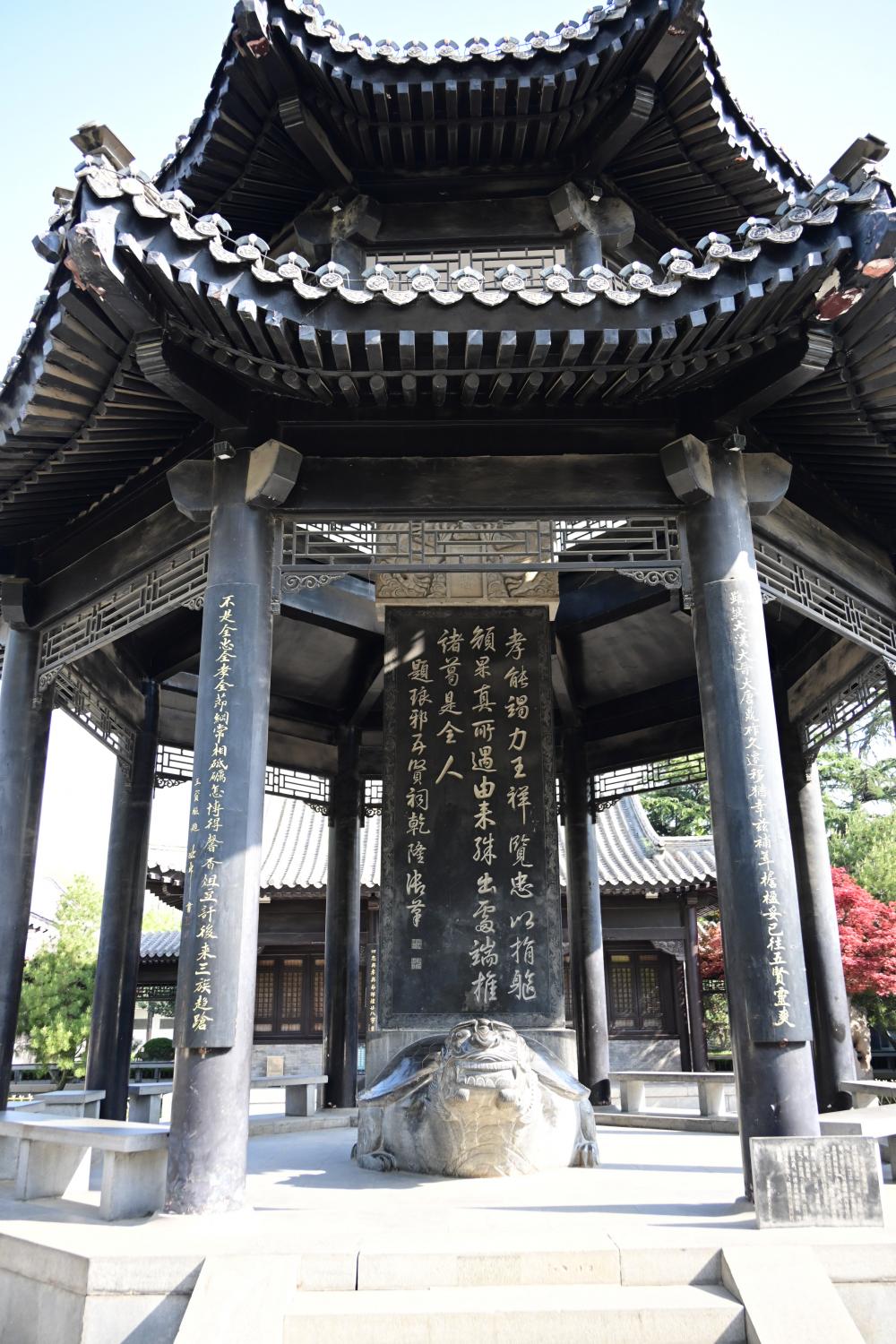 步入王羲之故居,先看到五贤祠,中间立着一块清代乾隆御笔碑。原碑立于清乾隆十六年,在特殊历史时期遭到彻底损毁,实物不复存在。眼眼的这块碑是依照历史原拓和旧貌,以1:1比例复刻的。