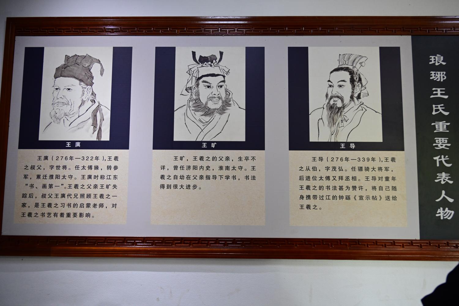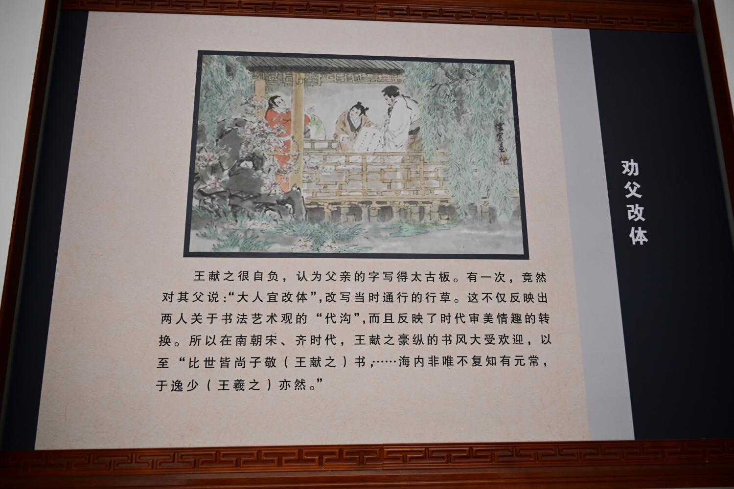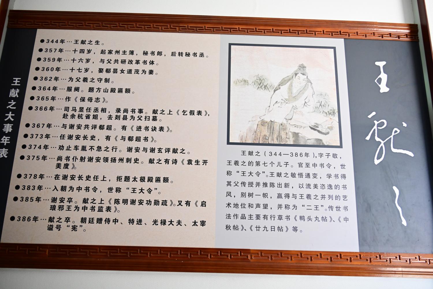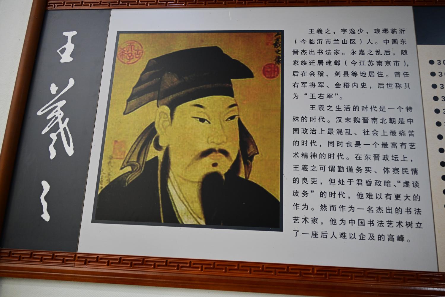 王羲之的人物生平简板上,介绍了王羲之的籍贯生平、时代际遇与历史成就,正本溯源书圣故里文脉,为游客完整游览故居做历史文化上的铺垫。