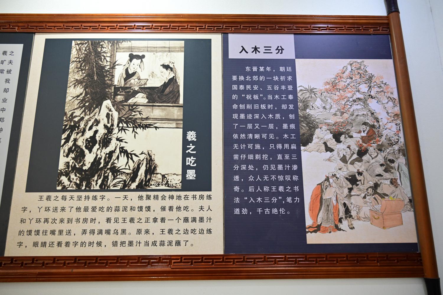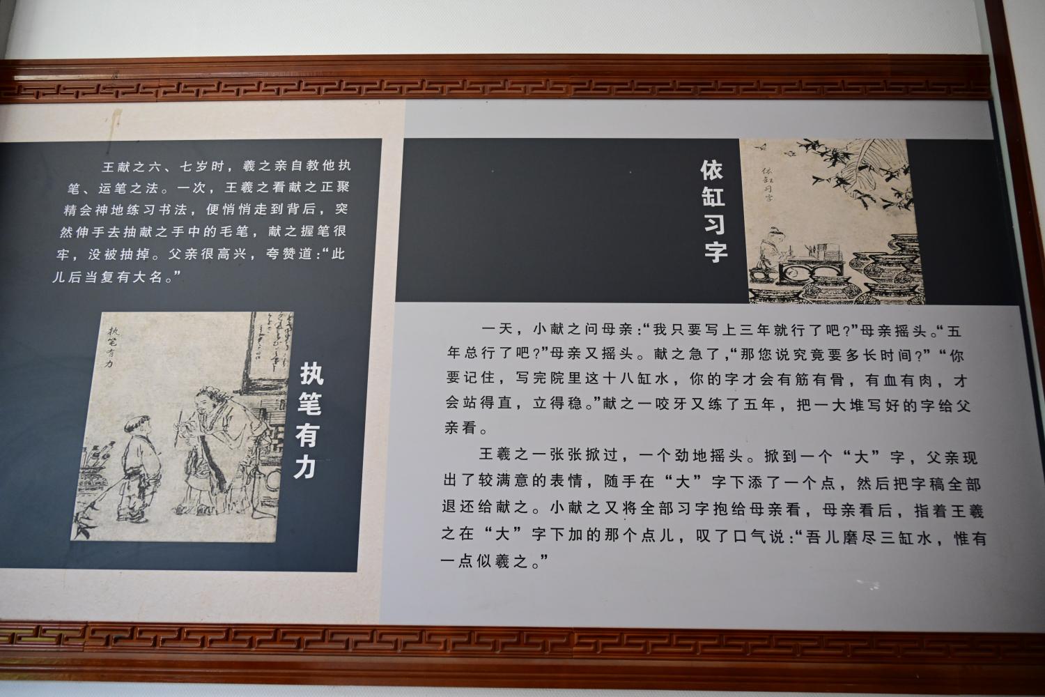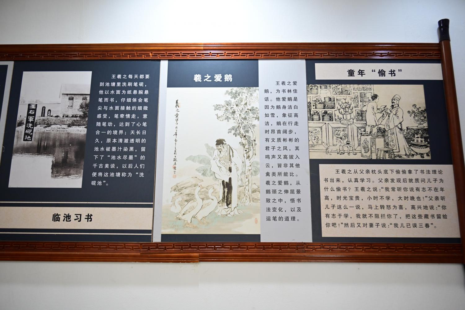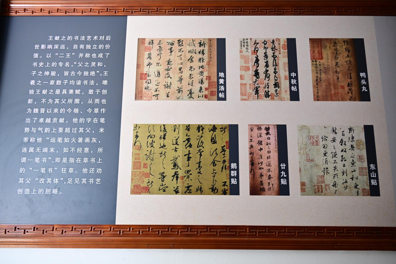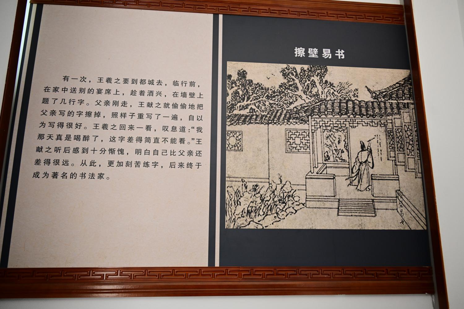 王羲之的人物生平简板上,介绍了王羲之的籍贯生平、时代际遇与历史成就,正本溯源书圣故里文脉,为游客完整游览故居做历史文化上的铺垫。