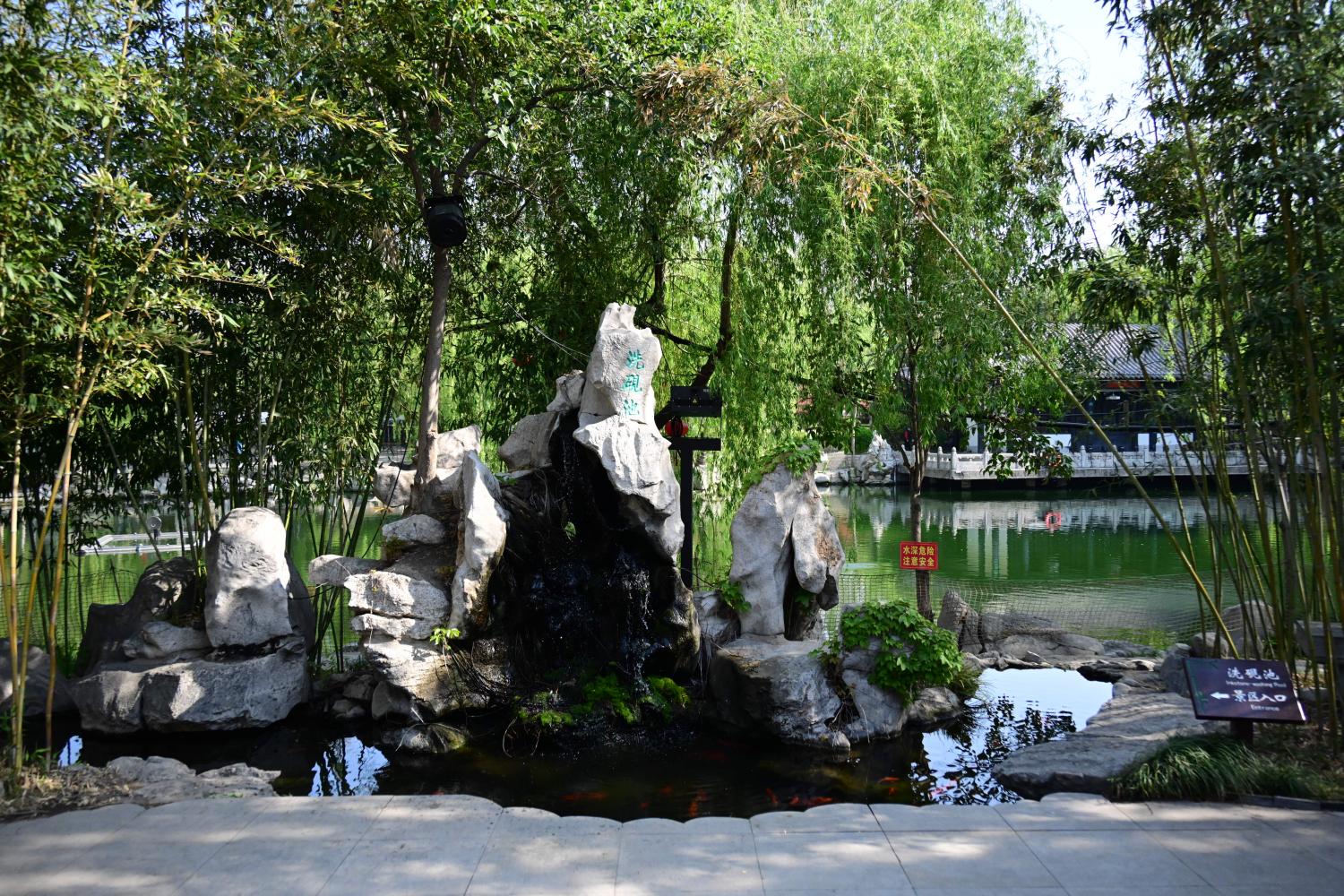 王羲之幼年每日在此练字,写完就到池中清洗毛笔、砚台,日复一日,清澈的池水被墨汁染成了黑色,因此得名洗砚池。