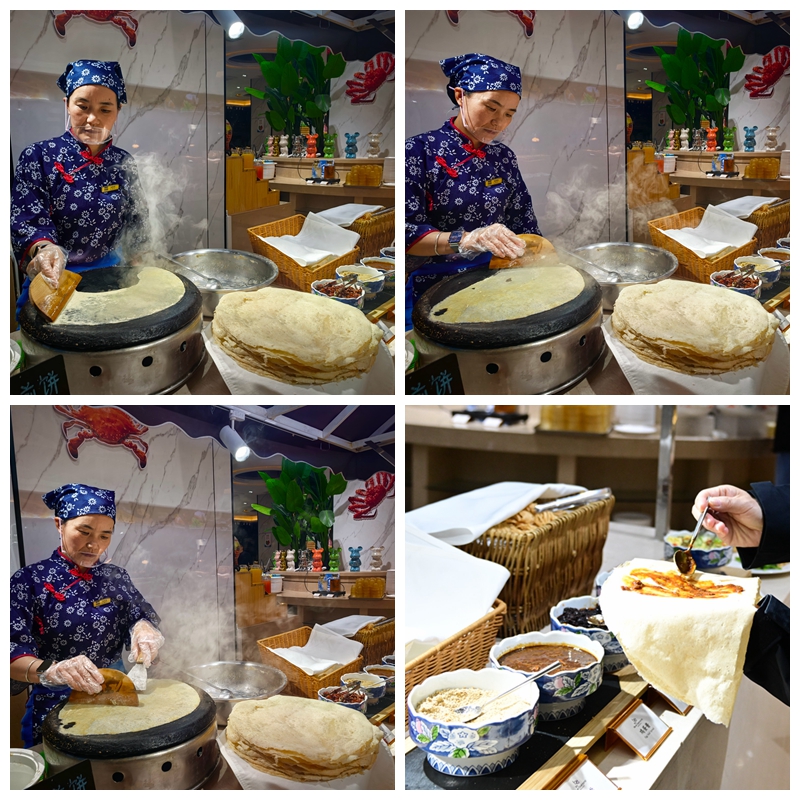 很没见识的样子,对着煎饼摊连按快门,引来领班的注意。搭讪中提出想带几张煎饼走,领班欣然同意,找来打包盒,装了几张煎饼给我们带走。