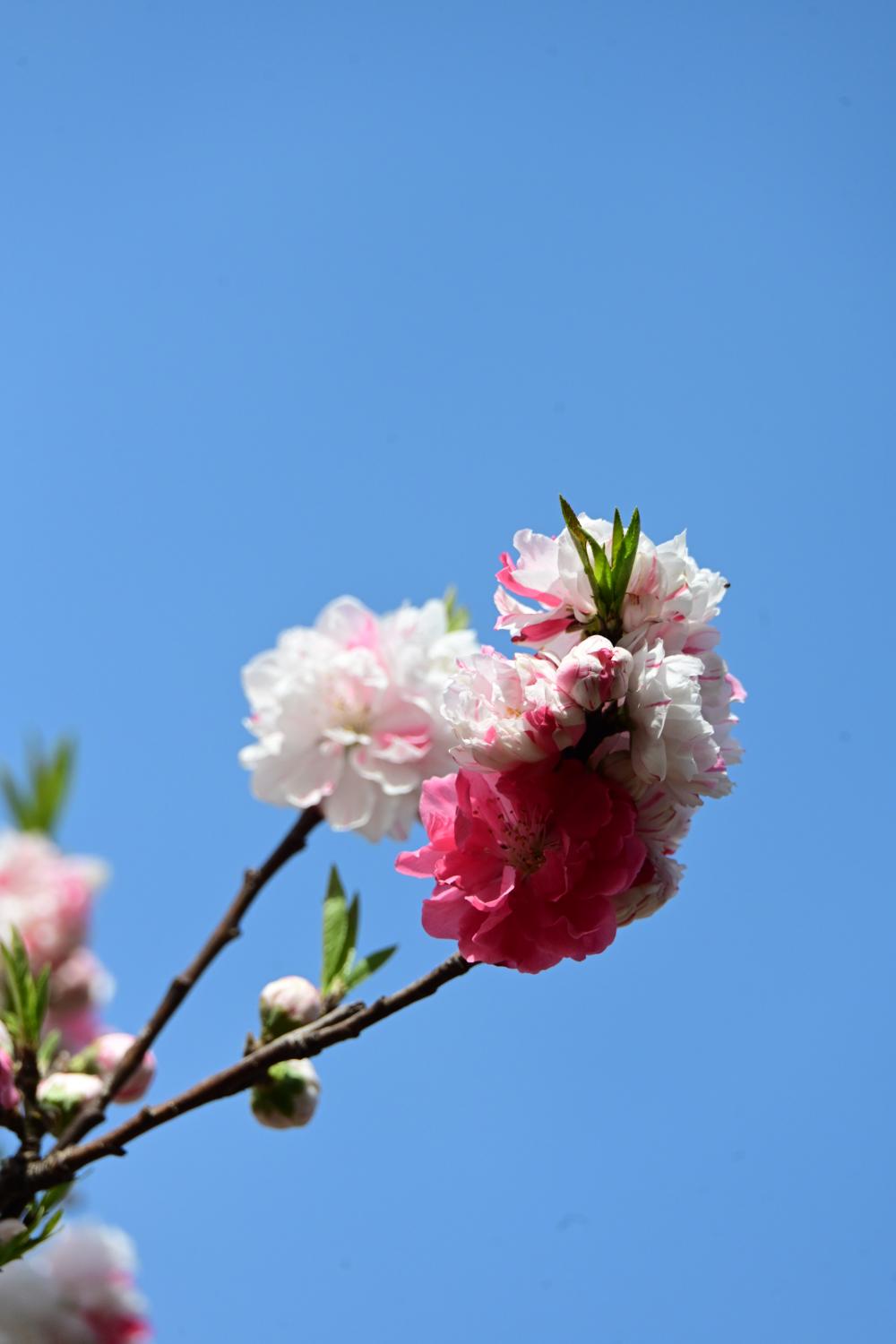 复色碧桃的花瓣底色多为白或淡粉,点缀着玫红的斑纹或镶边,甚至同一枝上能开出白、粉、深红等不同花色的花。