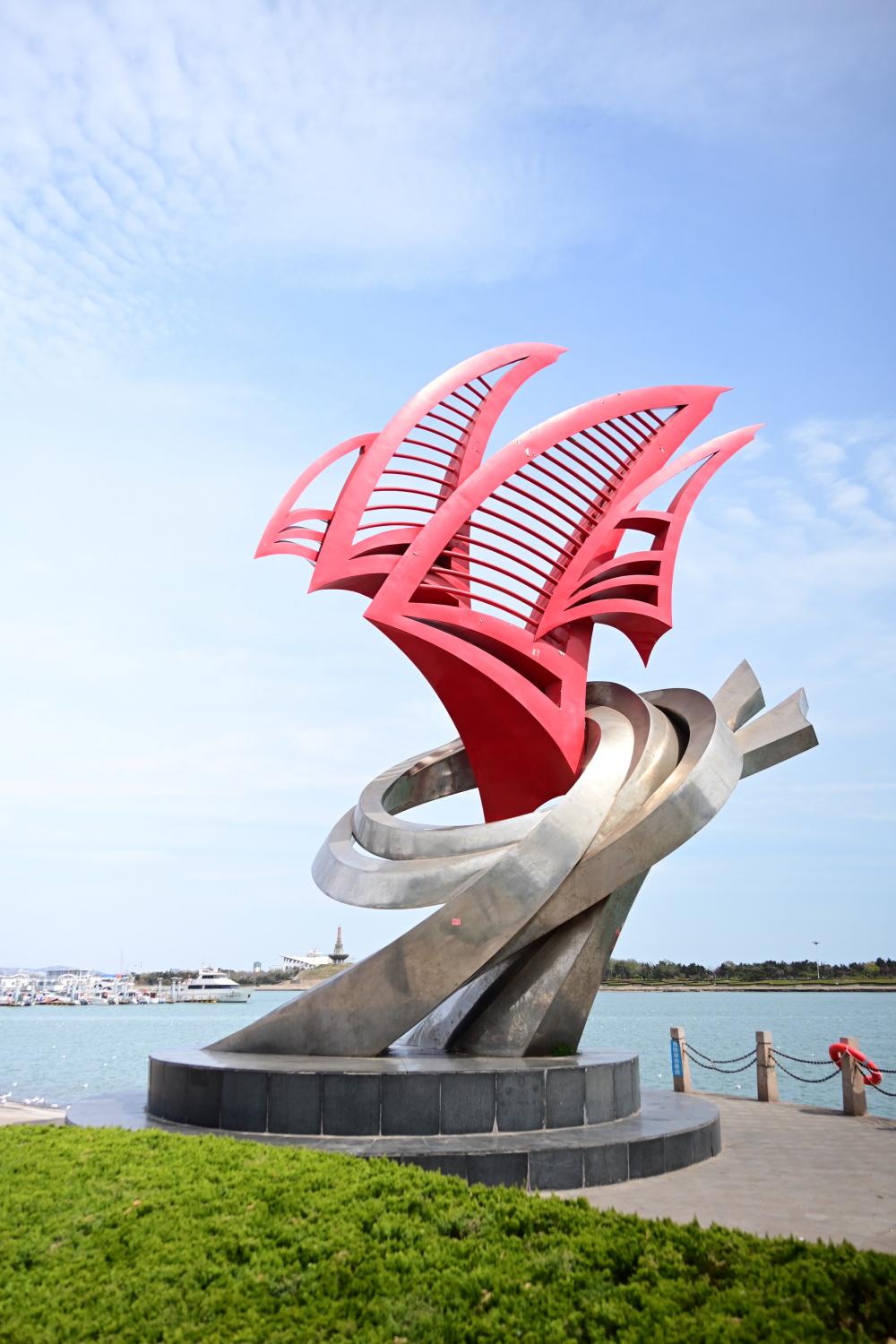 下图的帆船造型雕塑,以抽象的船帆为主体,红色的帆叶搭配银灰色的螺旋基座,象征着日照作为海滨城市的活力与乘风破浪的精神,也呼应了日照作为水上运动之都的帆船文化。